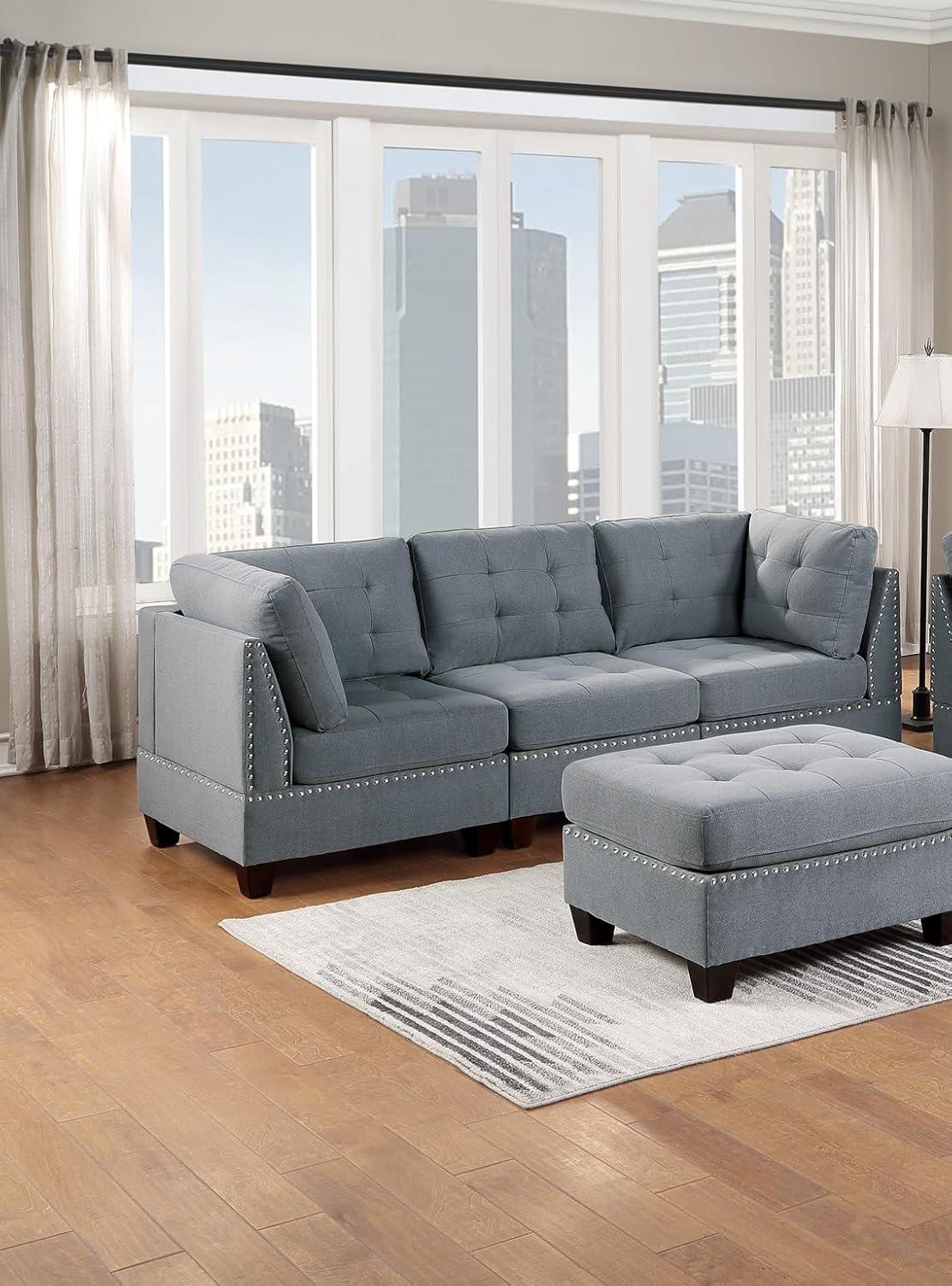 The set’s flexibility lets you experiment with layouts — for example, a classic L-shape, a U-shape with the ottoman as a footrest, or separated seating islands — but that same flexibility is a trade-off if you expect a single, compact sofa that tucks into a tiny apartment footprint. The gray,linen-like fabric looks contemporary and breathes better than some synthetics,yet it can show spills and pet hair more readily than certain performance fabrics; the tufted cushions and decorative nailheads add texture and formality,but they also create crevices that can trap crumbs and complicate deep cleaning. Small Space / Apartment Reality Check: