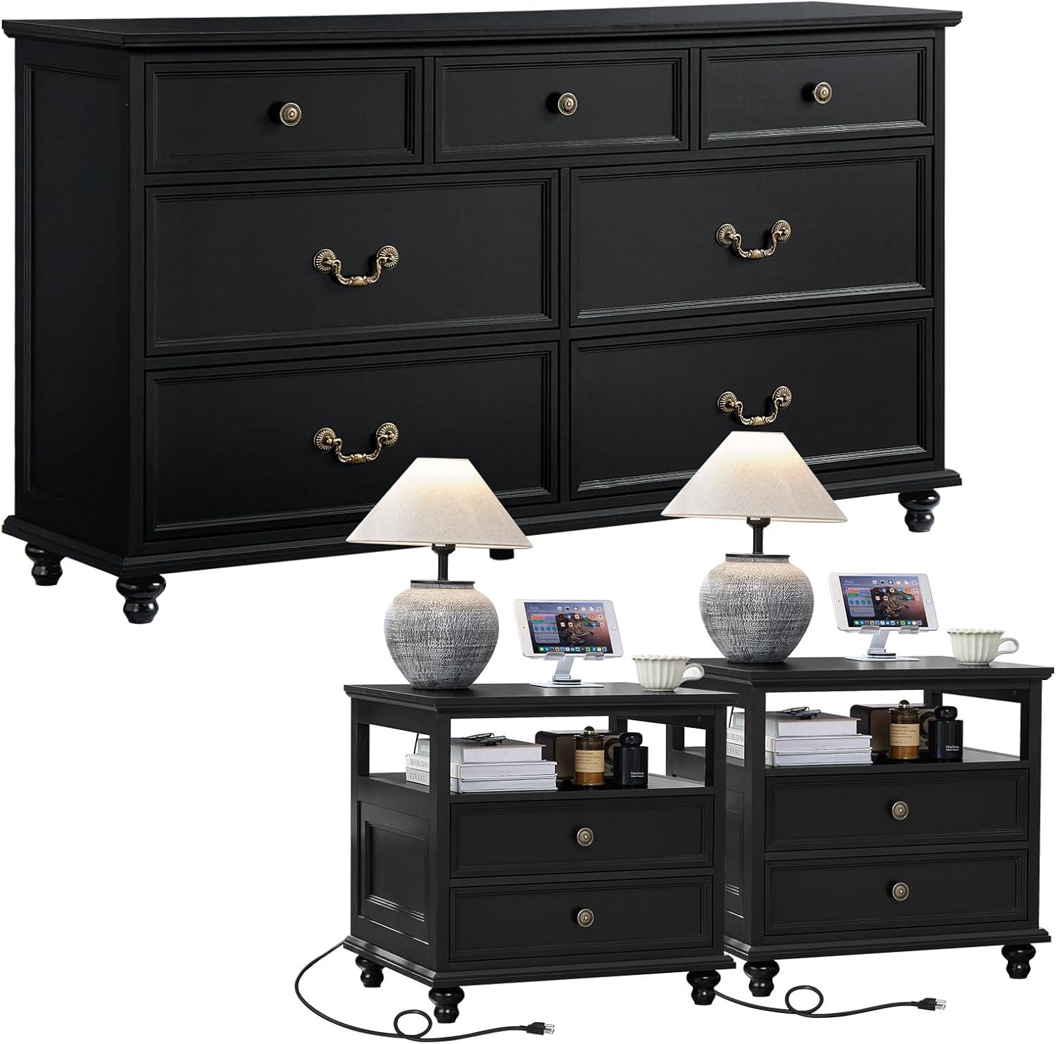 combining rustic charm with practical modern features, this furniture set brings a warm, inviting farmhouse aesthetic to any bedroom or living space. The dresser boasts seven drawers with a balanced mix of four large and three smaller compartments, providing thoughtful storage solutions while maintaining a clean, organized look. Its design is enhanced by vintage gourd-shaped solid wood legs and antique brass metal knobs, blending classic farmhouse vibes with subtle modern touches. Each nightstand complements the dresser perfectly, featuring the same rich wood tones and elegant lines that echo the set’s cohesive style. the natural wood finish and geometric drawer fronts add a subtle texture that invites you to appreciate the quality craftsmanship.