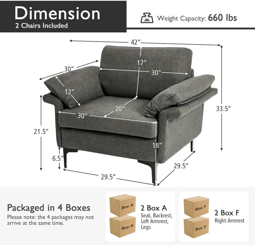 Measuring 42″ (L) x 30″ (W) x 33.5″ (H), these chairs provide ample space and comfort with an 18″ seat height and 21.5″ armrest height. Their soft, breathable upholstery and thoughtfully engineered support system make them suitable for various settings, from living rooms and bedrooms to offices and apartments. The lightweight yet durable construction supports up to 660 lbs, combining practicality with style for a versatile seating solution.