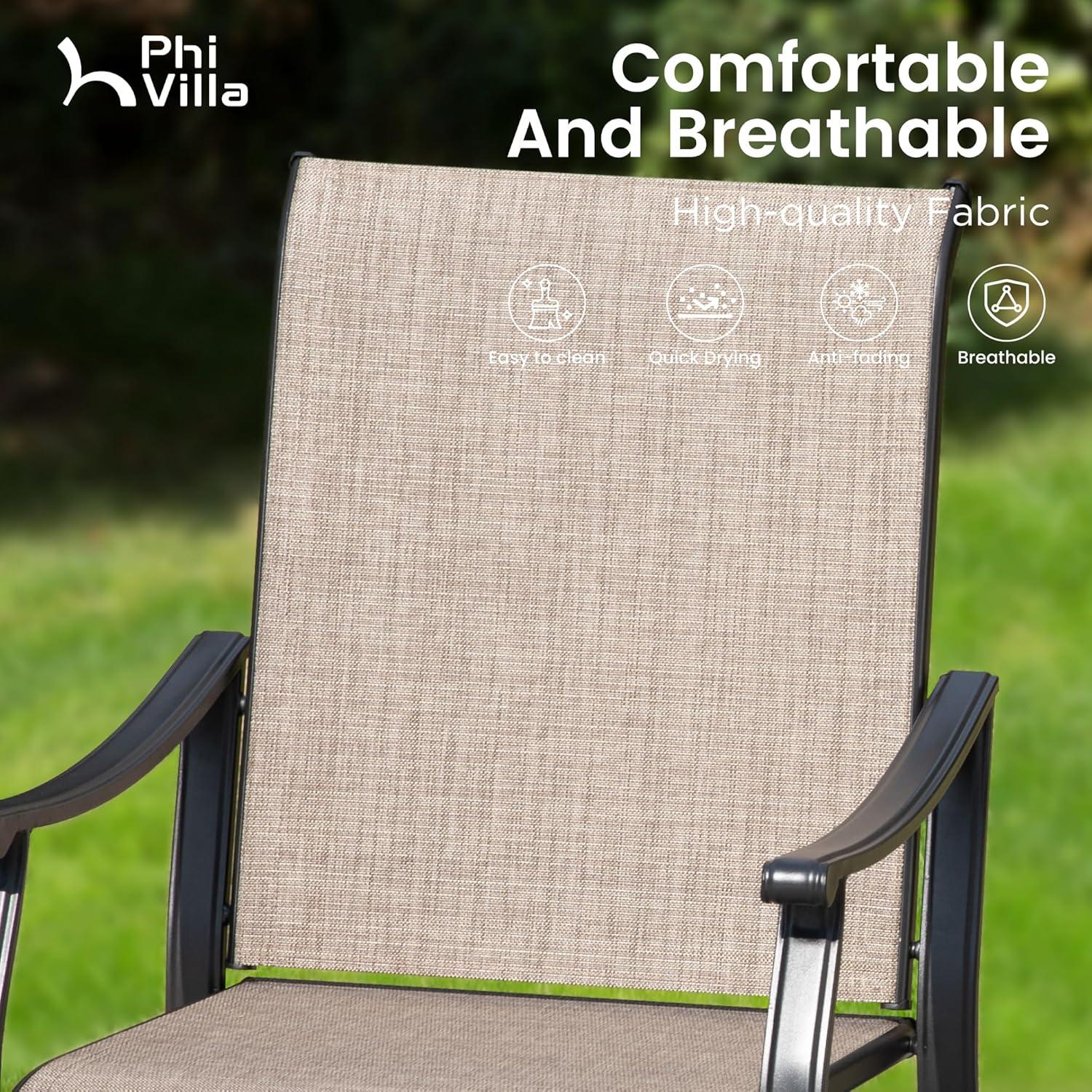 We found the breathable Textilene fabric of the chairs to be a real highlight in terms of comfort. Its design allows air to circulate, providing a cool seating experience even on warm days, while still offering ample shade. The inclusion of both armrests and backrests adds essential support, making long dinners or relaxed afternoons outdoors much more enjoyable. This combination of materials and thoughtful design reinforces the versatility of these chairs, proving them suitable not only for outdoor use but also adaptable to indoor settings.