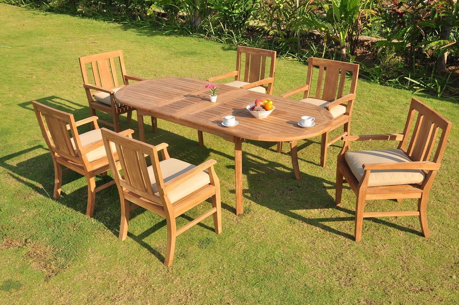 Crafted from premium Grade-A teak wood, this dining set promises extraordinary durability that withstands both indoor charm and outdoor elements. Teak’s natural oil content protects against moisture, decay, and insect damage, ensuring that the wood maintains its integrity for years to come. With solid construction and a robust finish, the oval table and arm chairs retain their sturdy feel even after frequent use. The smooth surface resists warping and cracking, making it a practical investment for any dining space.