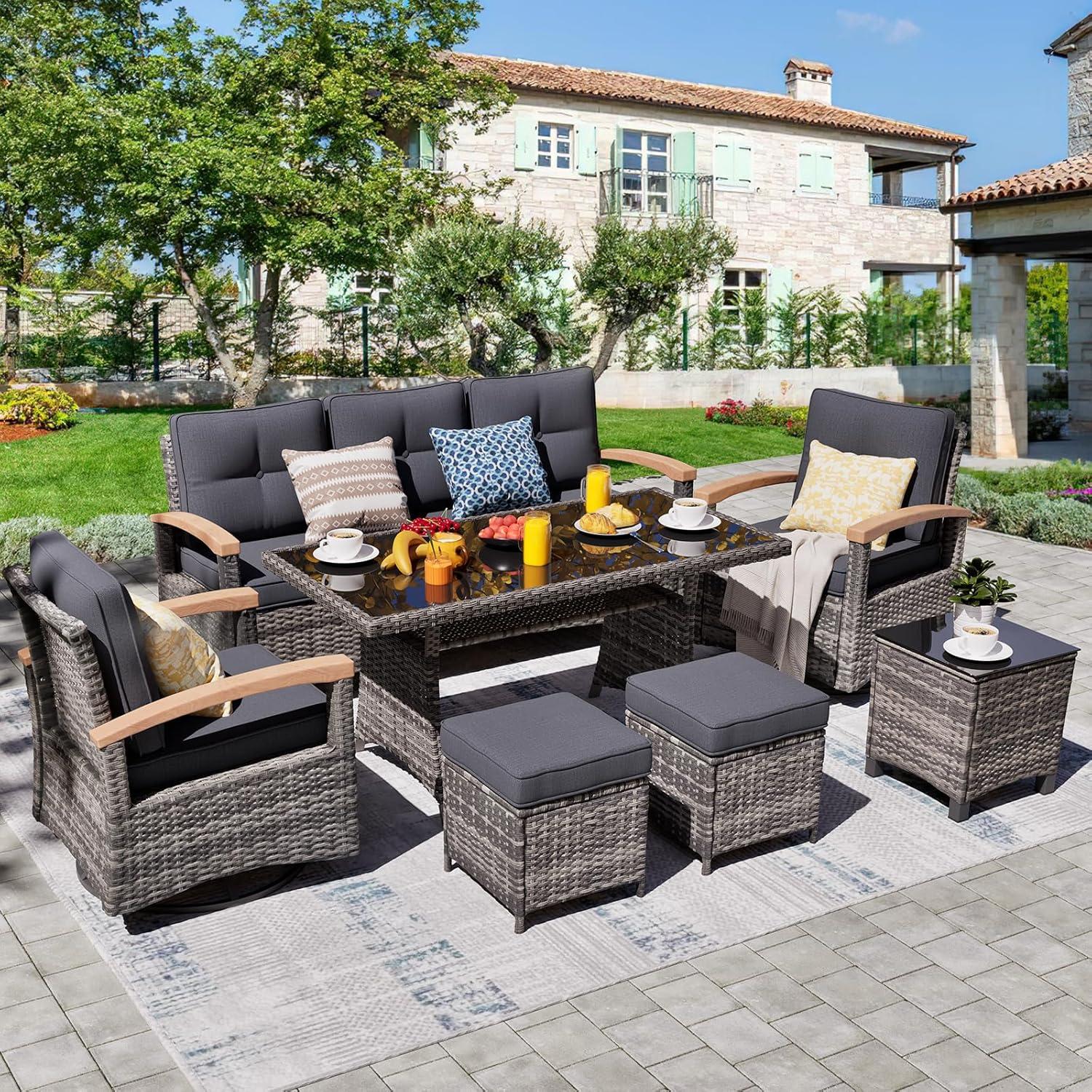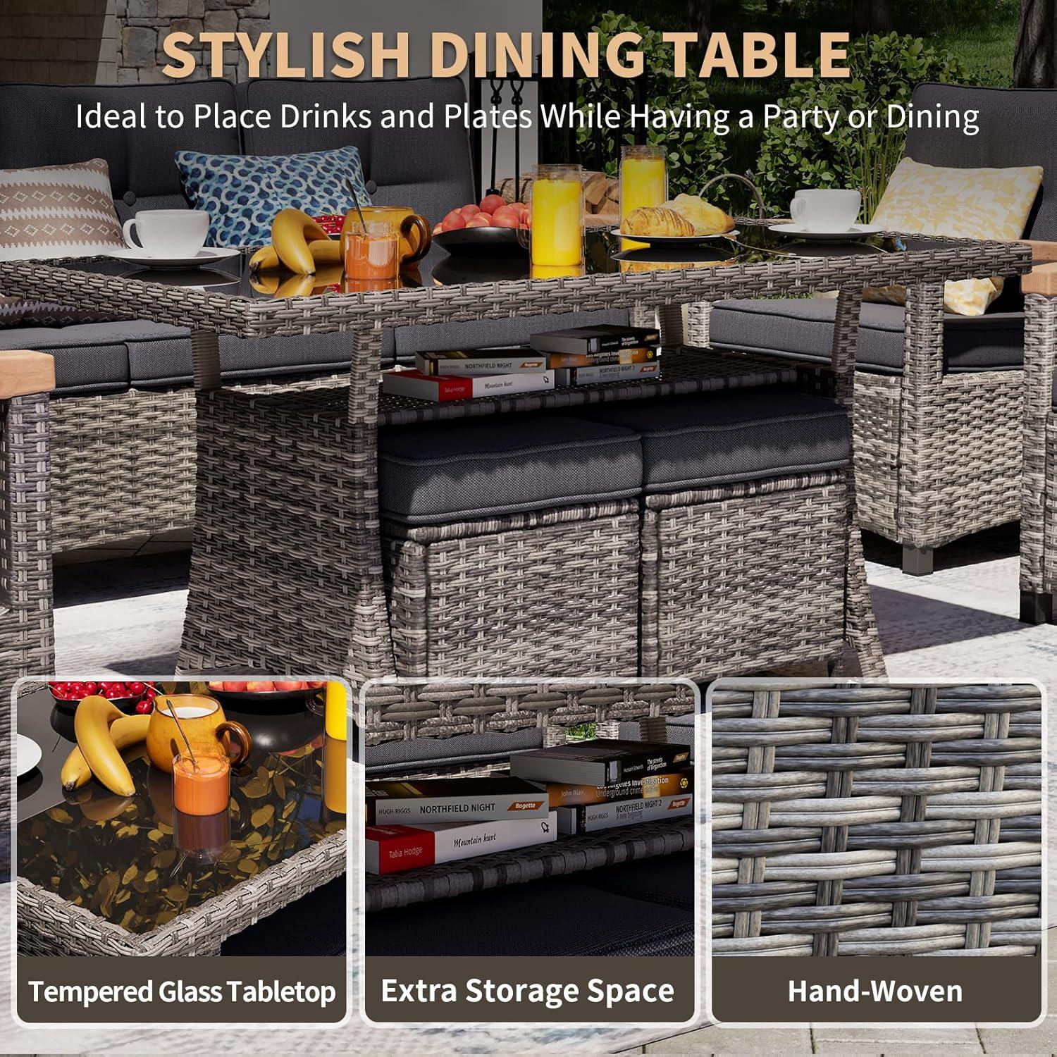In addition to its size, the table is crafted to withstand all weather conditions, thanks to its powder-coated steel frame and hand-woven PE rattan construction. This durability gives us confidence in using it year-round,rain or shine. Its smooth surface is easy to clean and resistant to stains, making post-meal cleanup hassle-free. Plus, the convenience of the ottomans and swivel rocker chairs with natural wood armrests complements the dining experience, offering comfort and adaptability during meals and conversations.