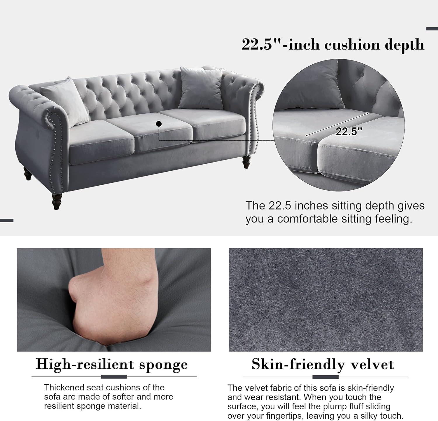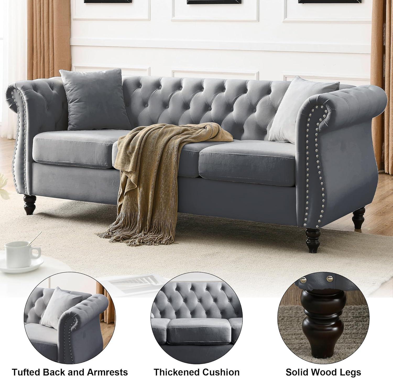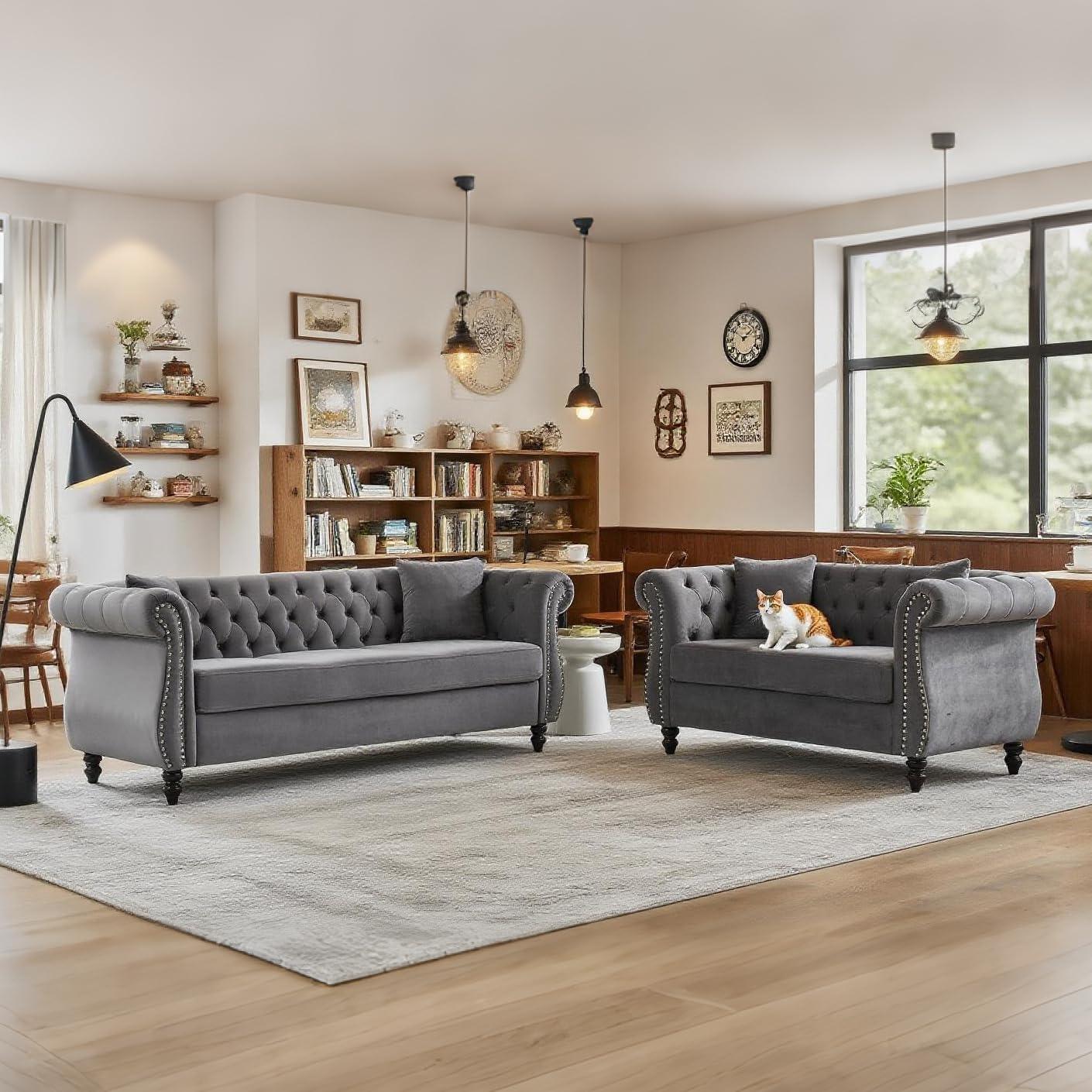 The timeless appeal of this sofa set makes it incredibly versatile across various interior styles. Whether your space leans toward minimalism, eclectic charm, or modern sophistication, the clean tufted details paired with rolled arms and nailhead trim offer a perfect balance between classic and contemporary. The soft gray velvet upholstery adds a neutral yet luxurious touch that blends seamlessly with bold accent colors or muted palettes alike. Its ergonomic design with comfortably low backs and plush cushions creates an inviting vibe, enhancing cozy living rooms, chic bedrooms, or even stylish office lounges without overwhelming the surroundings.