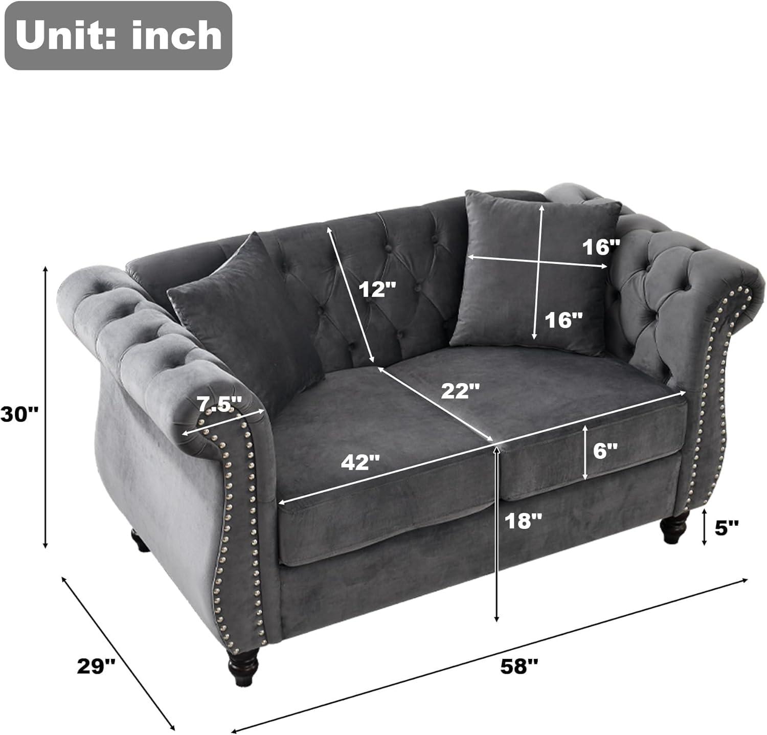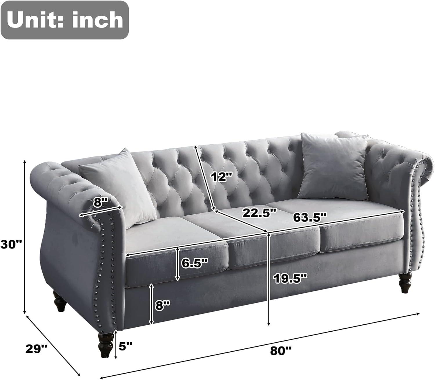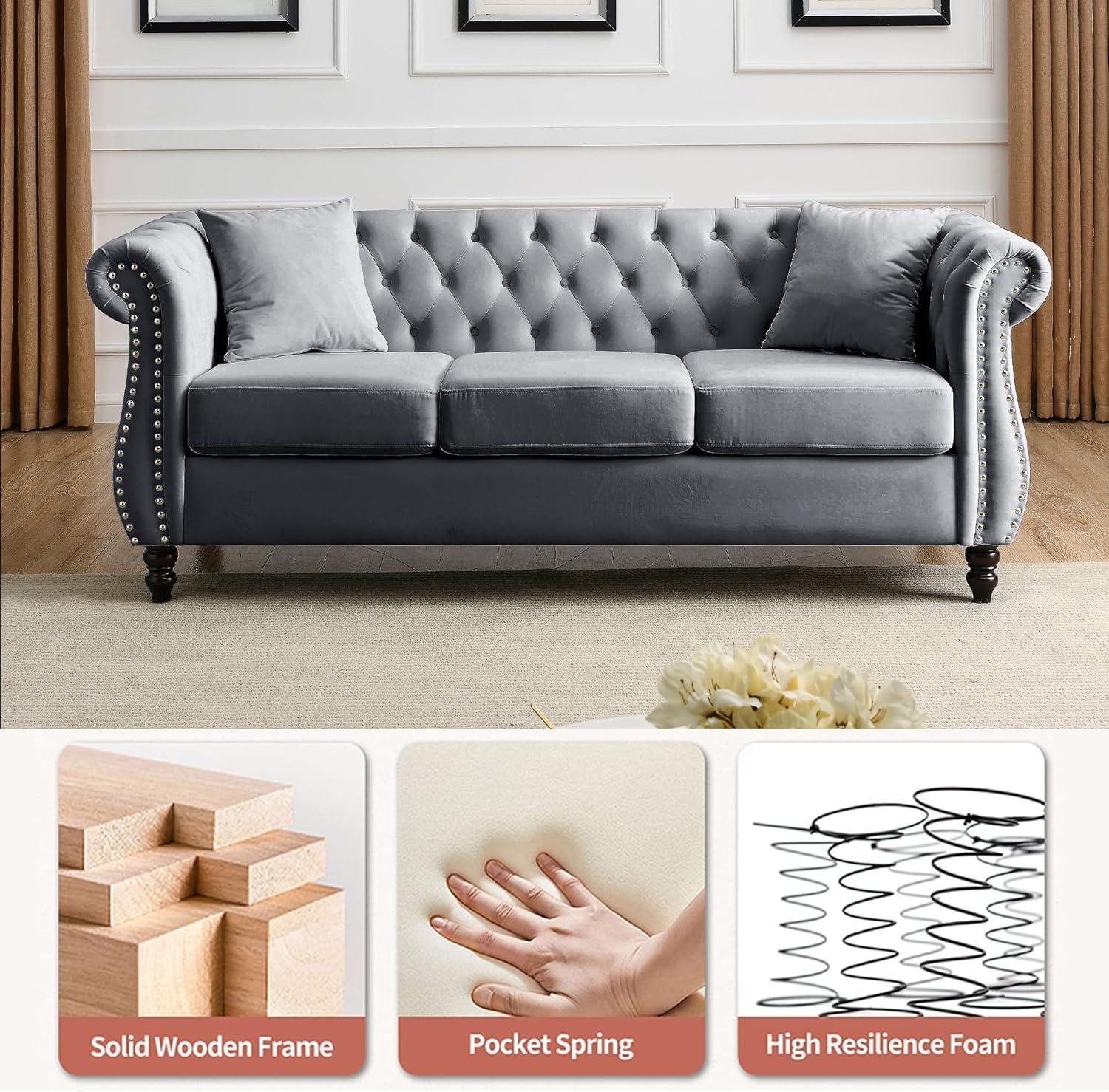 The timeless appeal of this sofa set makes it incredibly versatile across various interior styles. Whether your space leans toward minimalism, eclectic charm, or modern sophistication, the clean tufted details paired with rolled arms and nailhead trim offer a perfect balance between classic and contemporary. The soft gray velvet upholstery adds a neutral yet luxurious touch that blends seamlessly with bold accent colors or muted palettes alike. Its ergonomic design with comfortably low backs and plush cushions creates an inviting vibe, enhancing cozy living rooms, chic bedrooms, or even stylish office lounges without overwhelming the surroundings.