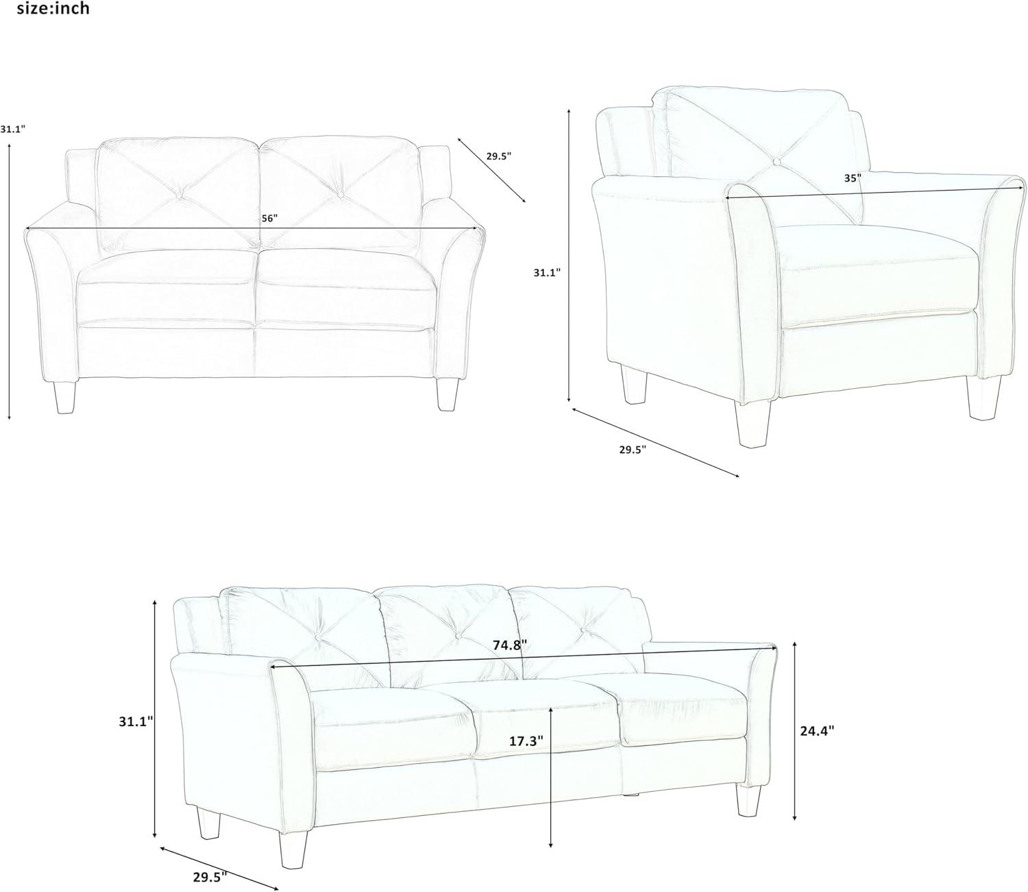 This versatile set adapts beautifully to a variety of room layouts, making it ideal for both compact apartments and spacious living areas alike. Thanks to the modular design, each piece can be arranged independently-whether lined up to create a cozy sectional or separated for multiple seating zones. The compact loveseat and armchair easily fit into corners or side nooks, while the sofa offers ample seating without overwhelming the room. Its sleek silhouette with rolled arms and tufted backs lends itself well to classic, modern, and transitional décor themes, providing both style and function without clashing with existing furnishings.
