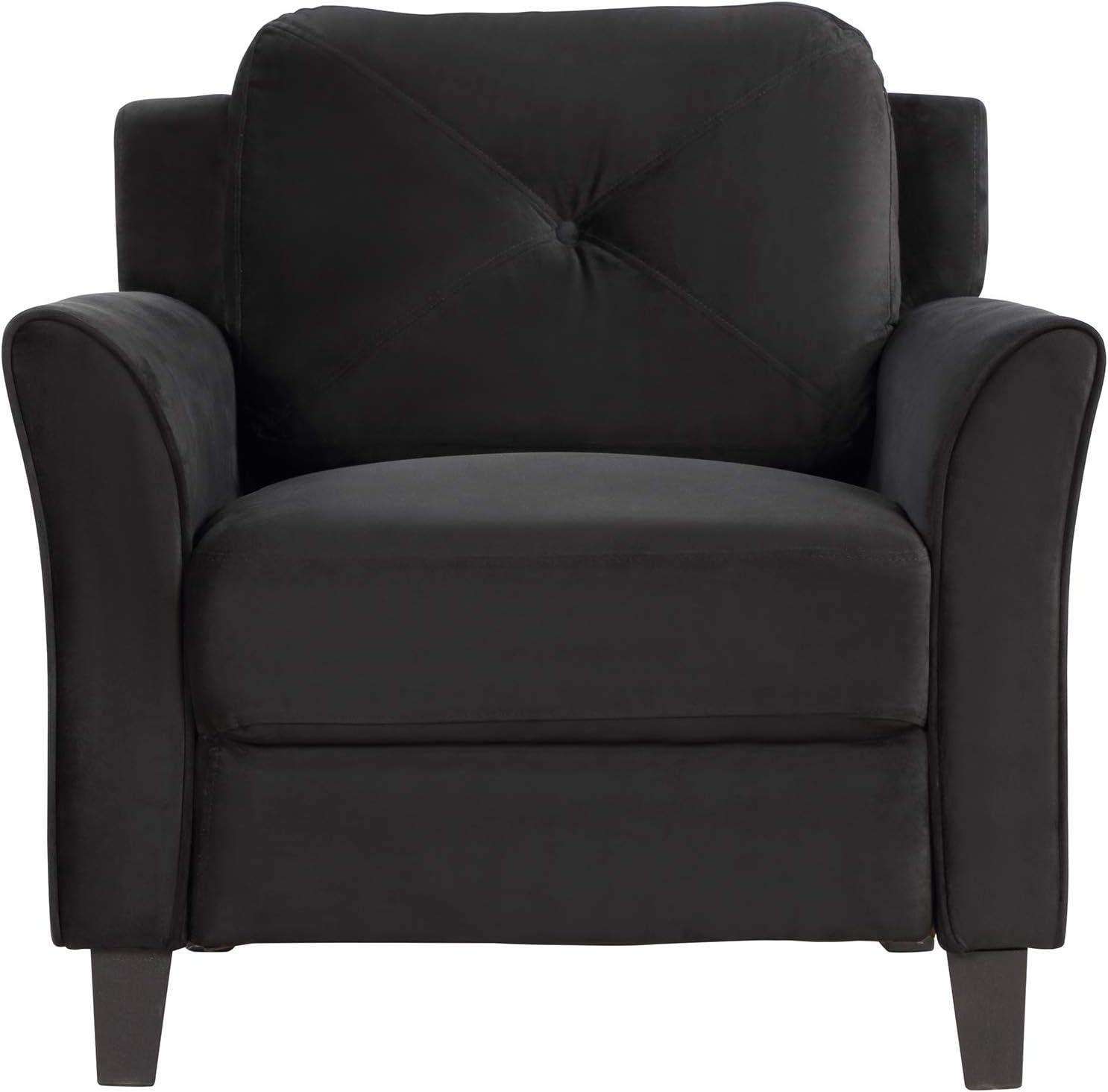 The armchair presents a visually appealing combination of classic charm and modern sophistication. Its button-tufted cushion back and rolled, flared arms contribute to a timeless aesthetic that complements a variety of décor styles. Upholstered in a soft polyester blend, the texture is inviting and durable, while the sleek black plastic legs add an understated contrast that elevates its overall look. the clean lines balance elegance with simplicity, making the armchair a versatile piece that can seamlessly fit in both cozy living rooms and professional home office setups.