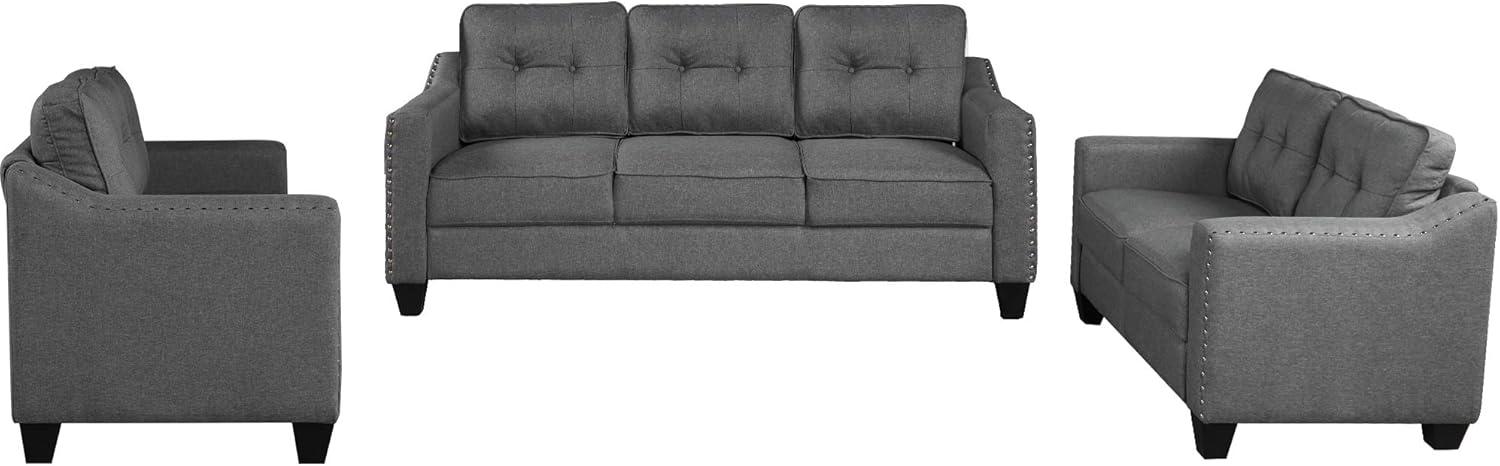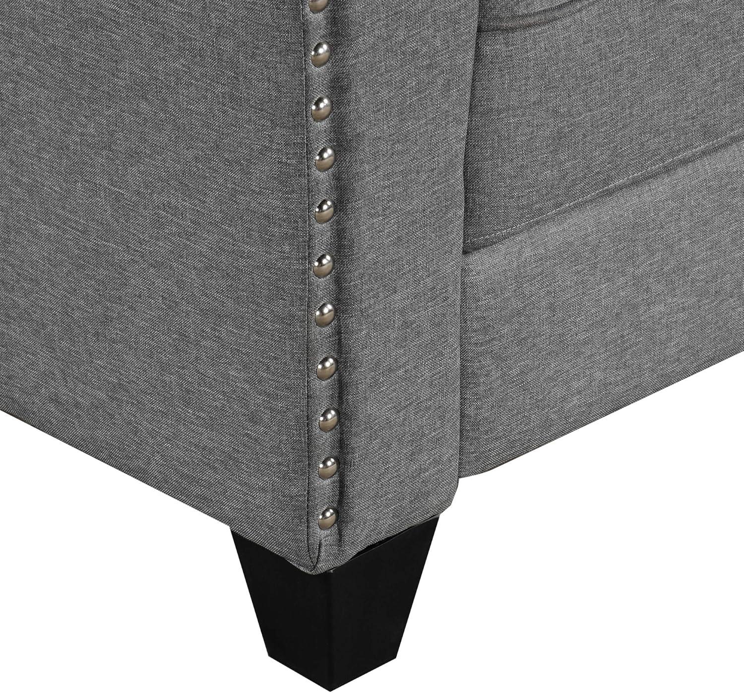 | Elegant contemporary design with tasteful brass nail head trim and tufted backs adds a refined touch to any living room. | The gray linen fabric, while soft and inviting, is prone to showing stains and may require frequent spot cleaning. |