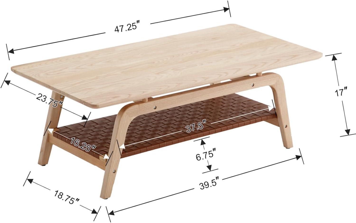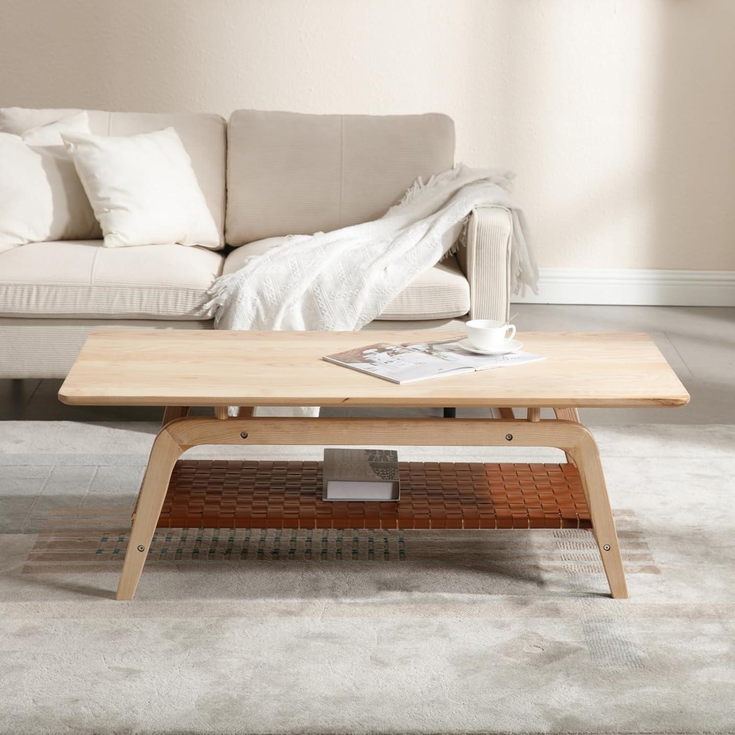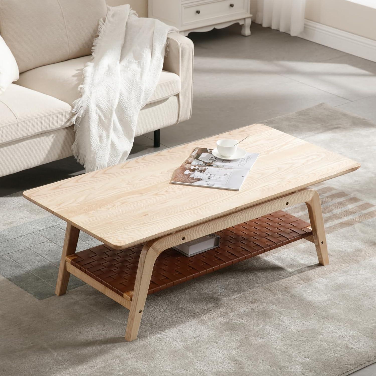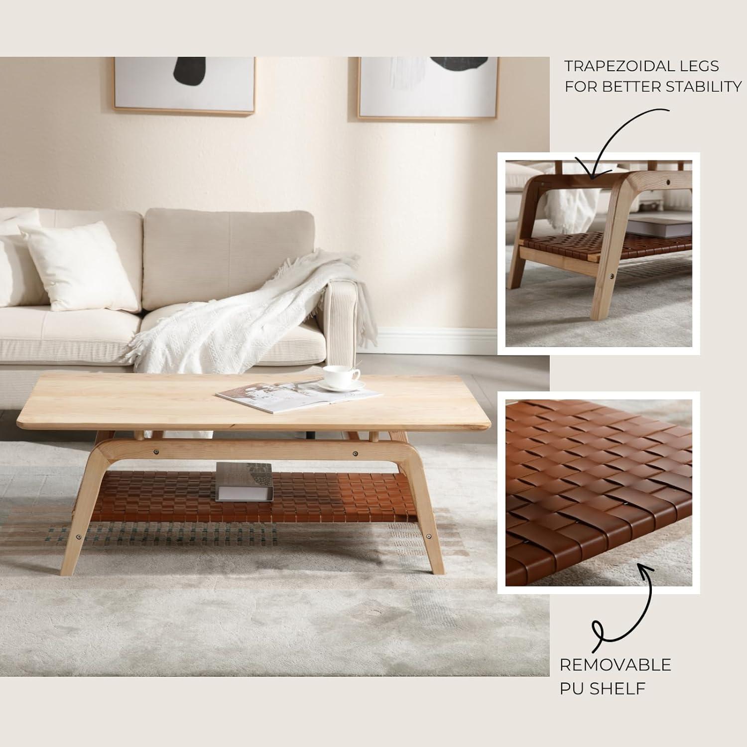 Our experience with this piece reveals how effortlessly it blends into a variety of living room aesthetics. whether you embrace a minimalist, mid-century modern, or eclectic décor, the clean lines and trapezoidal legs offer a subtle yet striking architectural presence. The natural wood surface paired with the woven PU leather shelf provides a balanced contrast, adding warmth and texture without overwhelming your existing design elements. its spacious two-tier layout not only enhances organization by keeping your magazines, books, and decorative items neatly arranged but also serves as a practical anchor that grounds the arrangement of furniture in the space.