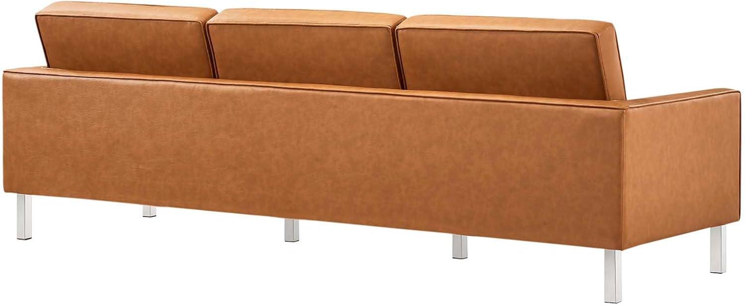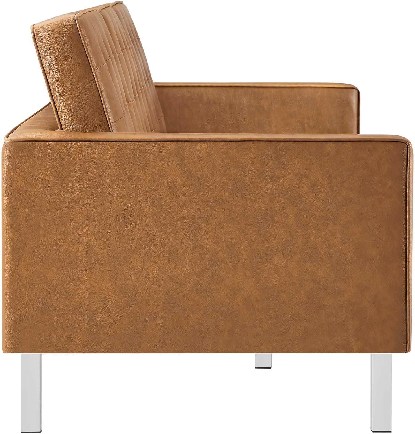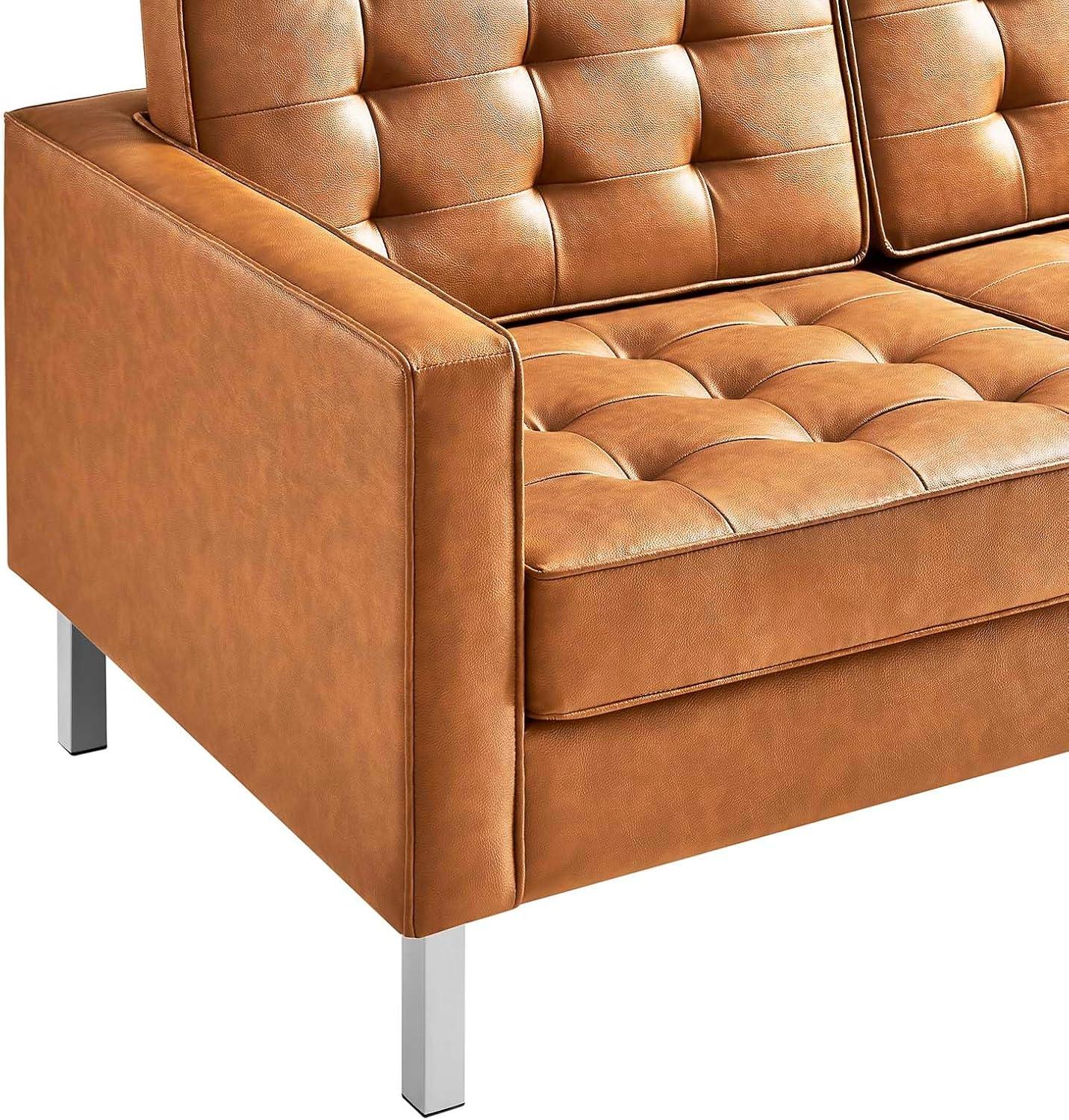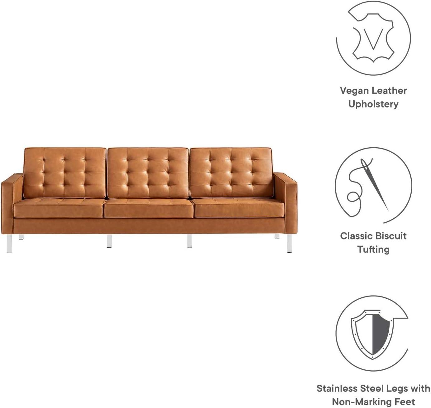 The tufted button design truly elevates the overall look, giving the sofa an unmistakable mid-century modern vibe while maintaining a sleek and polished finish. Each cushion is expertly crafted with classic biscuit tufting that complements the smooth vegan leather upholstery, creating a sophisticated texture and visual rhythm across the seating surface. This tailor-made detail is further enhanced by the subtle trim piping, which neatly outlines each cushion, highlighting the clean, linear structure without overwhelming the eye. The silver tan color brings warmth and versatility, pairing superbly with a variety of décor styles from minimalist to more eclectic settings.