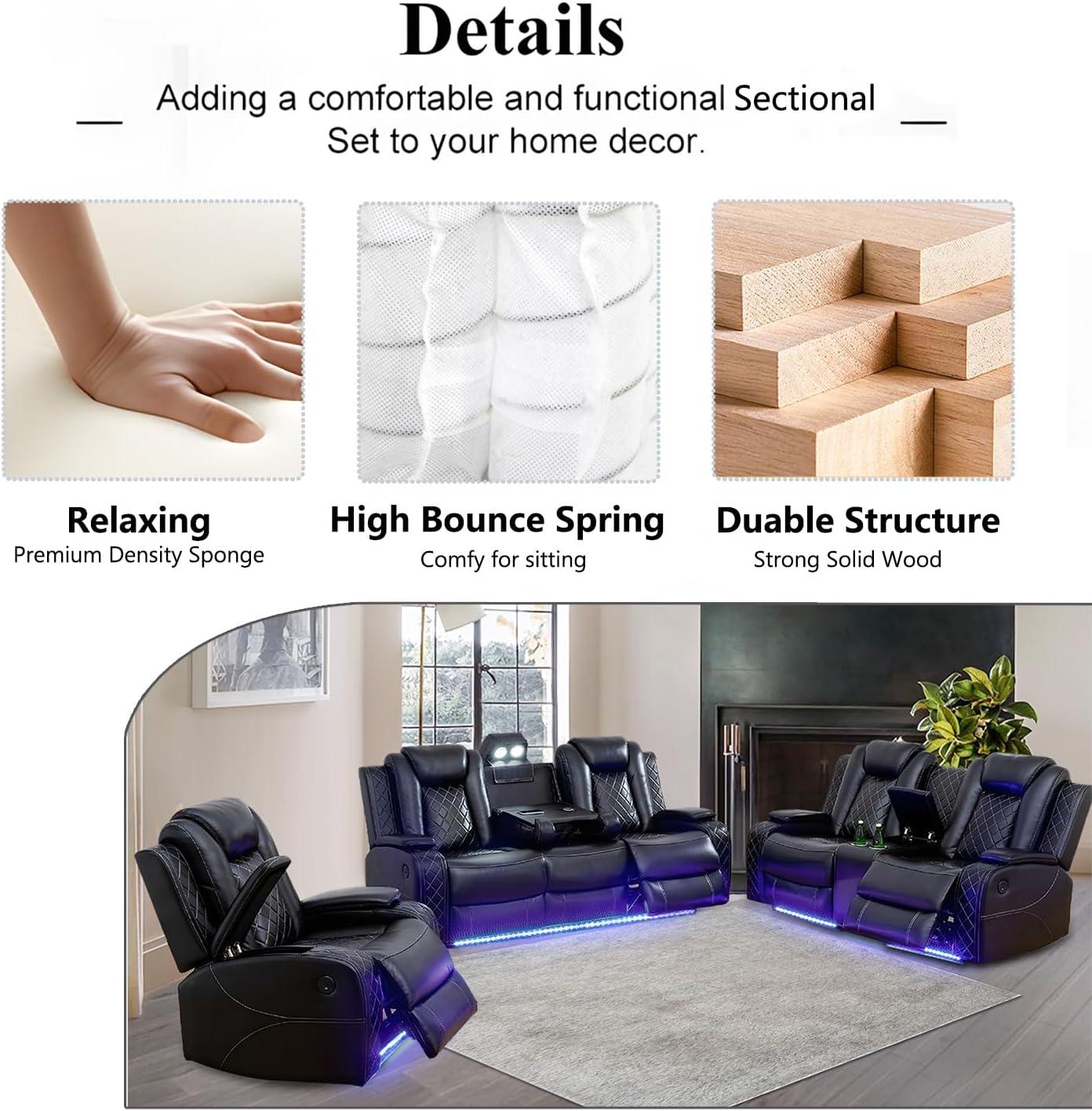One of the standout features that truly transforms our living space is the subtle yet effective LED lighting built into the recliner sofa set. This ambient lighting adds a modern touch without being overpowering, creating a cozy atmosphere perfect for unwinding after a long day or hosting movie nights. Positioned strategically alongside cup holders and the storage console, the LED lights not only serve an aesthetic purpose but also improve functionality by softly illuminating these practical areas-making it easier to locate your drink or control ports without disturbing others. The gentle glow promotes relaxation and elevates the overall mood in the room, turning our living area into a stylish retreat.