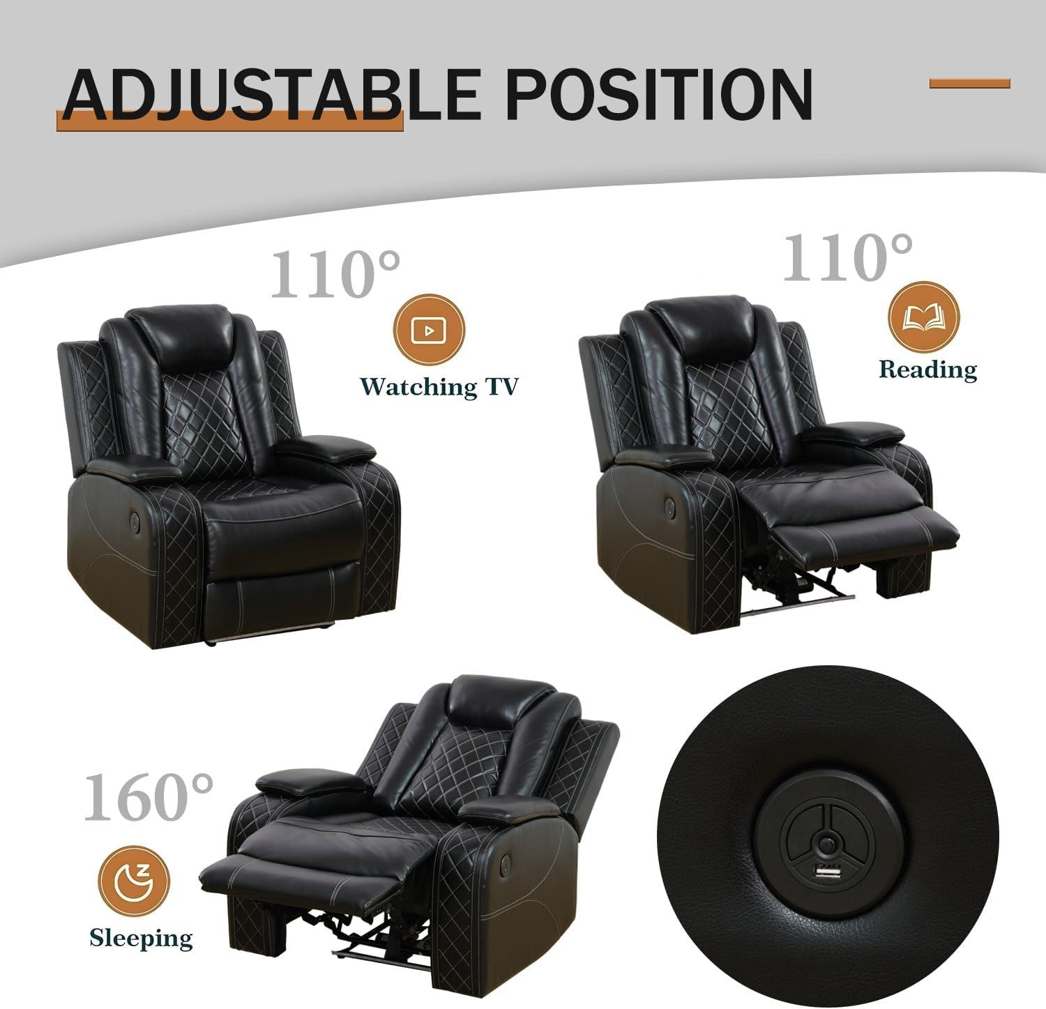 From the moment we unpacked this living room furniture set, it was clear that comfort and convenience were at the forefront of its design.The sleek black faux leather is not only visually striking but also impressively durable and easy to clean, making it an excellent choice for busy households. Ergonomically crafted, each piece provides excellent support for the neck, waist, shoulders, and legs, allowing for full relaxation whether you’re watching TV or enjoying a good book.The reclining mechanism is smooth and intuitive, with manual controls that adjust the backrest from a comfortable 105° up to a fully reclined 160°, making it simple to find your ideal lounging position.
