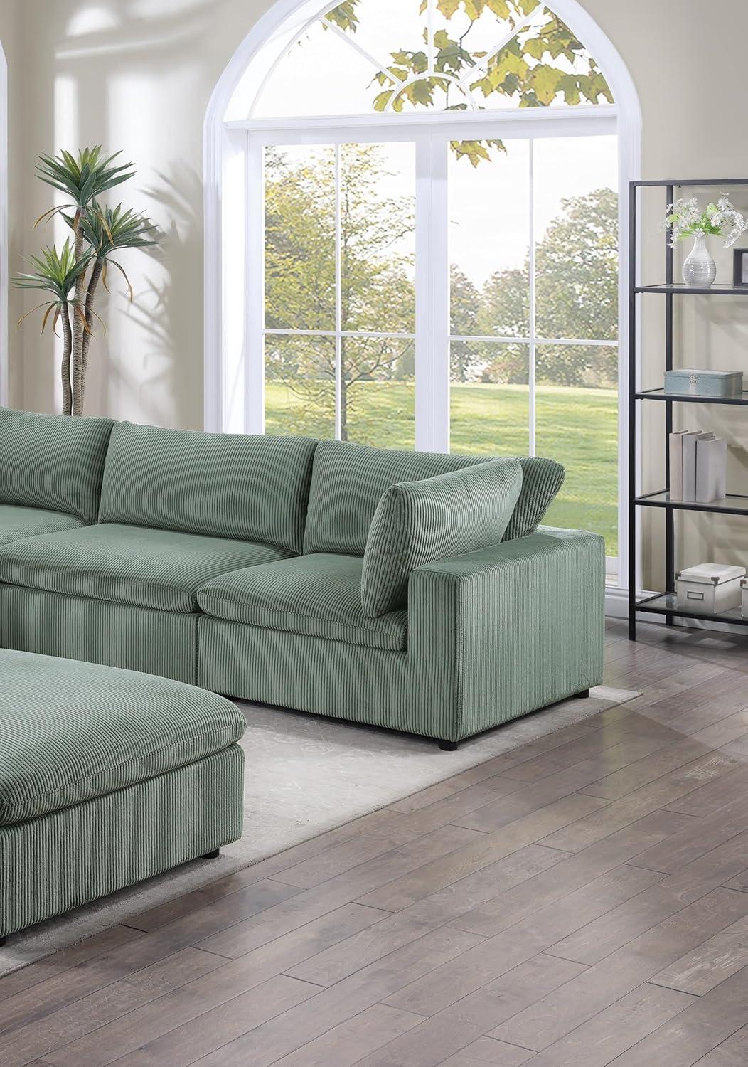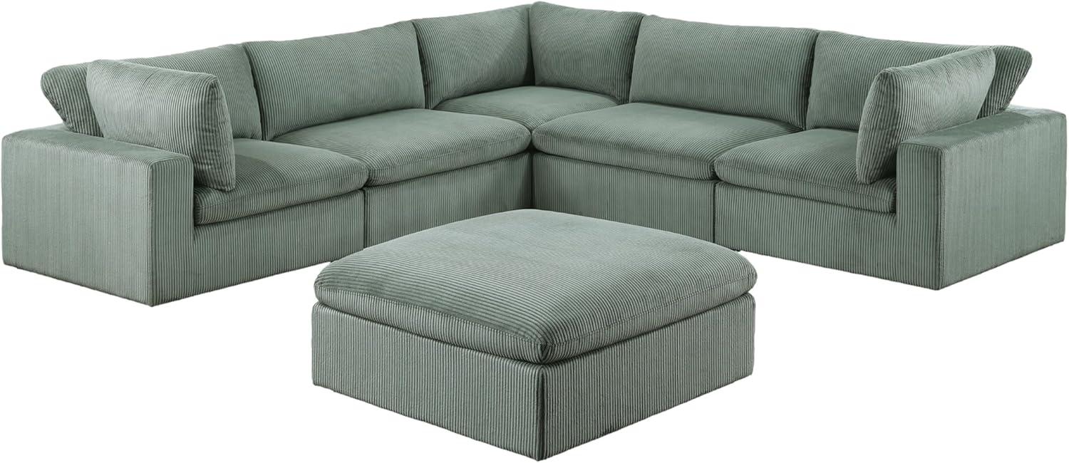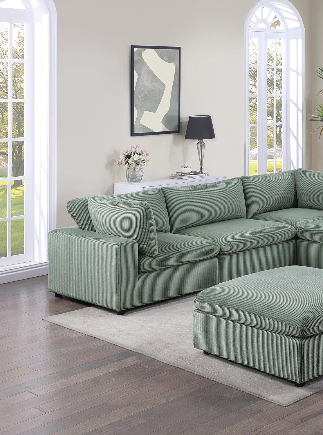 Blending comfort with versatility, this six-piece modular sectional set offers a fresh twist on contemporary living room furniture. Wrapped in soft corduroy upholstery, the sage hue adds a subtle yet sophisticated touch that easily complements a variety of interior styles.The plush cushions invite relaxation,while the modular design-with three corner wedges,two armless chairs,and an ottoman-provides flexible seating arrangements to fit our unique space requirements.Whether arranged as a cozy corner setup or an open lounge area, the sectional’s clean lines and inviting texture elevate the room’s ambiance without overwhelming it.