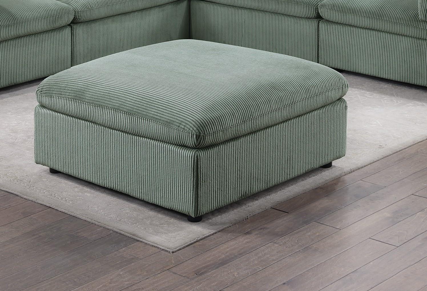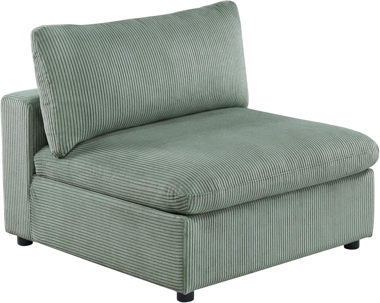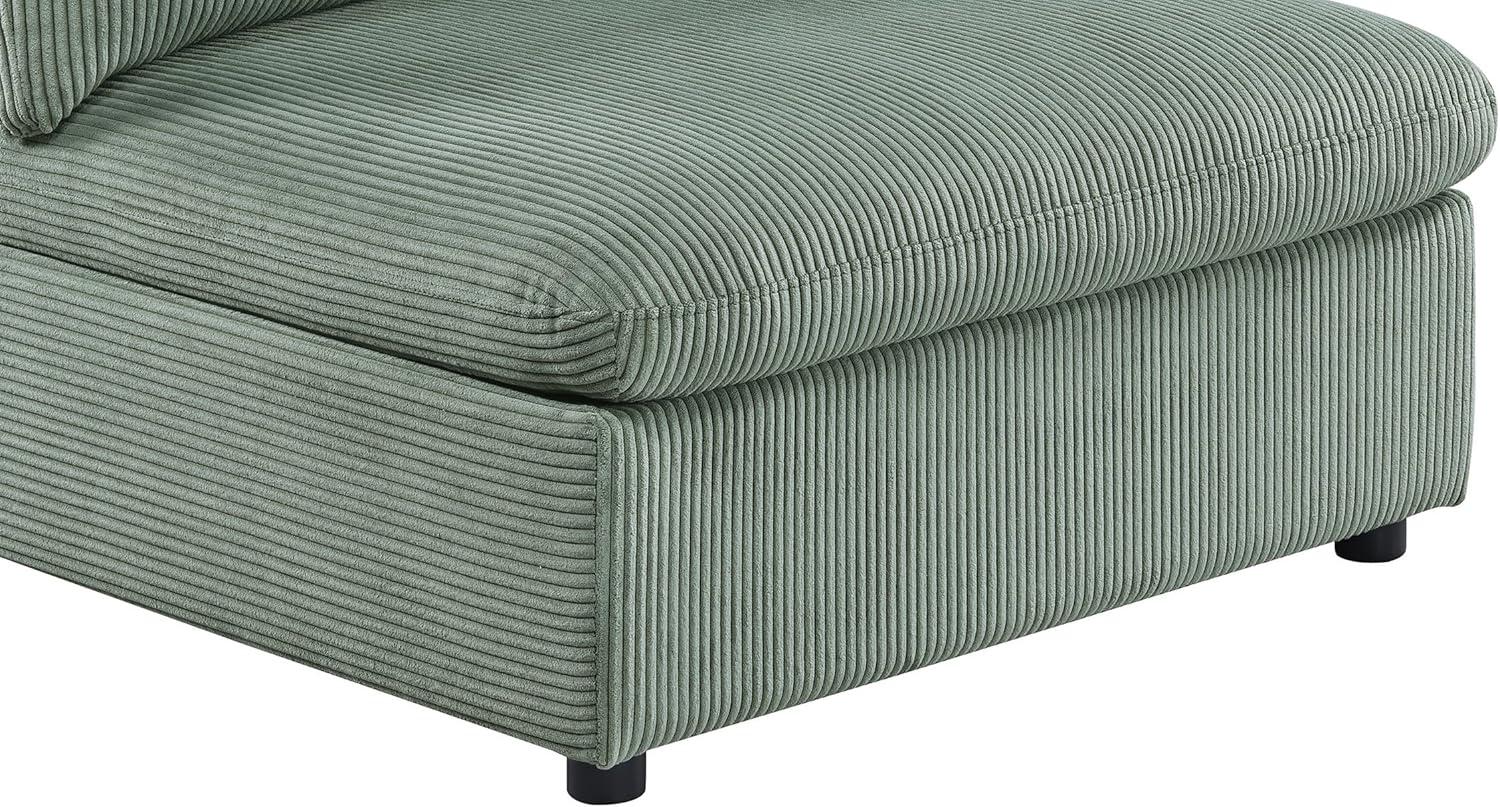 Blending comfort with versatility, this six-piece modular sectional set offers a fresh twist on contemporary living room furniture. Wrapped in soft corduroy upholstery, the sage hue adds a subtle yet sophisticated touch that easily complements a variety of interior styles.The plush cushions invite relaxation,while the modular design-with three corner wedges,two armless chairs,and an ottoman-provides flexible seating arrangements to fit our unique space requirements.Whether arranged as a cozy corner setup or an open lounge area, the sectional’s clean lines and inviting texture elevate the room’s ambiance without overwhelming it.