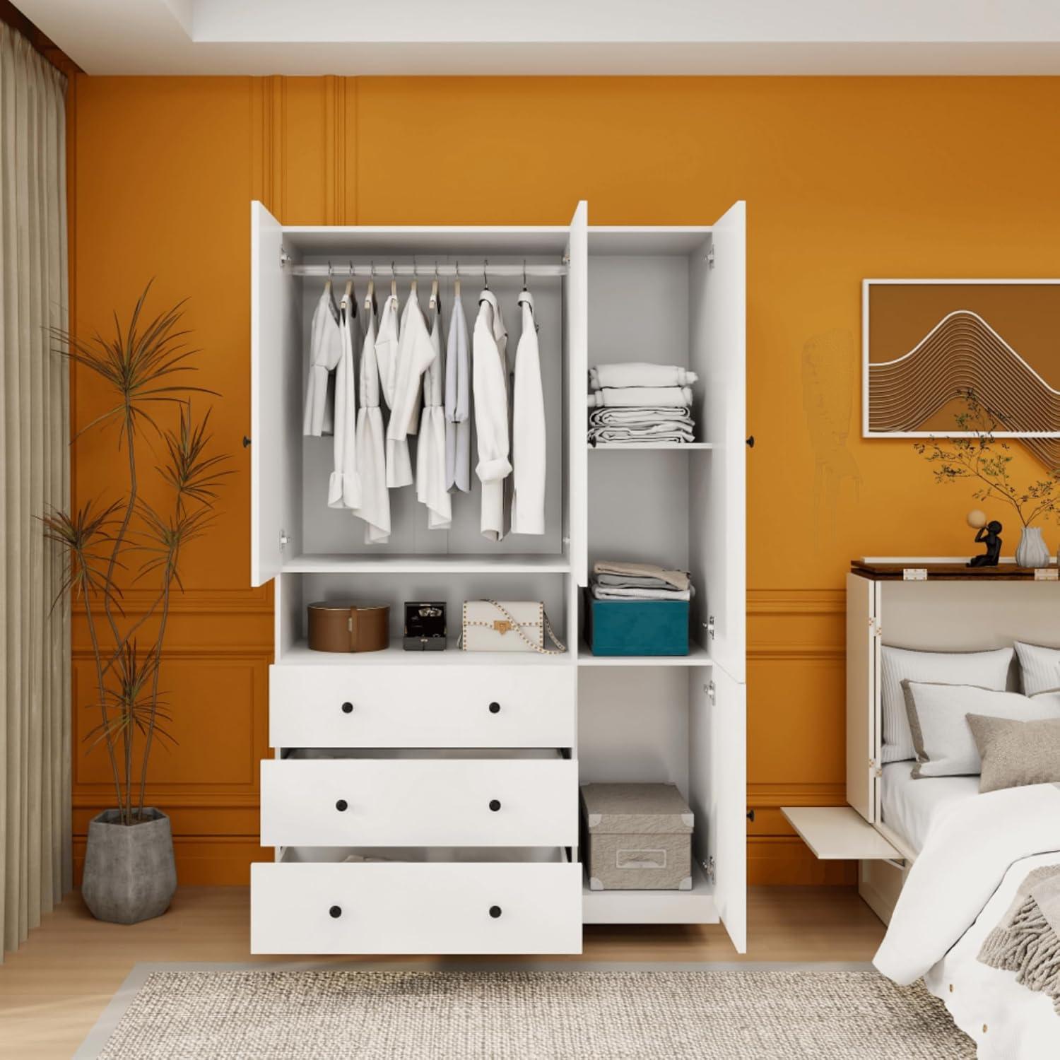 With its clean white finish and minimalist structure, this wardrobe effortlessly complements a wide range of interior design styles. Its unadorned surfaces and straightforward silhouette make it a versatile piece that can blend seamlessly into both modern and traditional rooms. Whether placed in a serene Scandinavian bedroom, a cozy farmhouse-style space, or even a contemporary office, the cabinet’s elegant simplicity enhances rather than overwhelms the surrounding décor. The sizeable footprint and multi-door layout also present a balanced visual weight, keeping the wardrobe grounded while maintaining a sleek appearance.