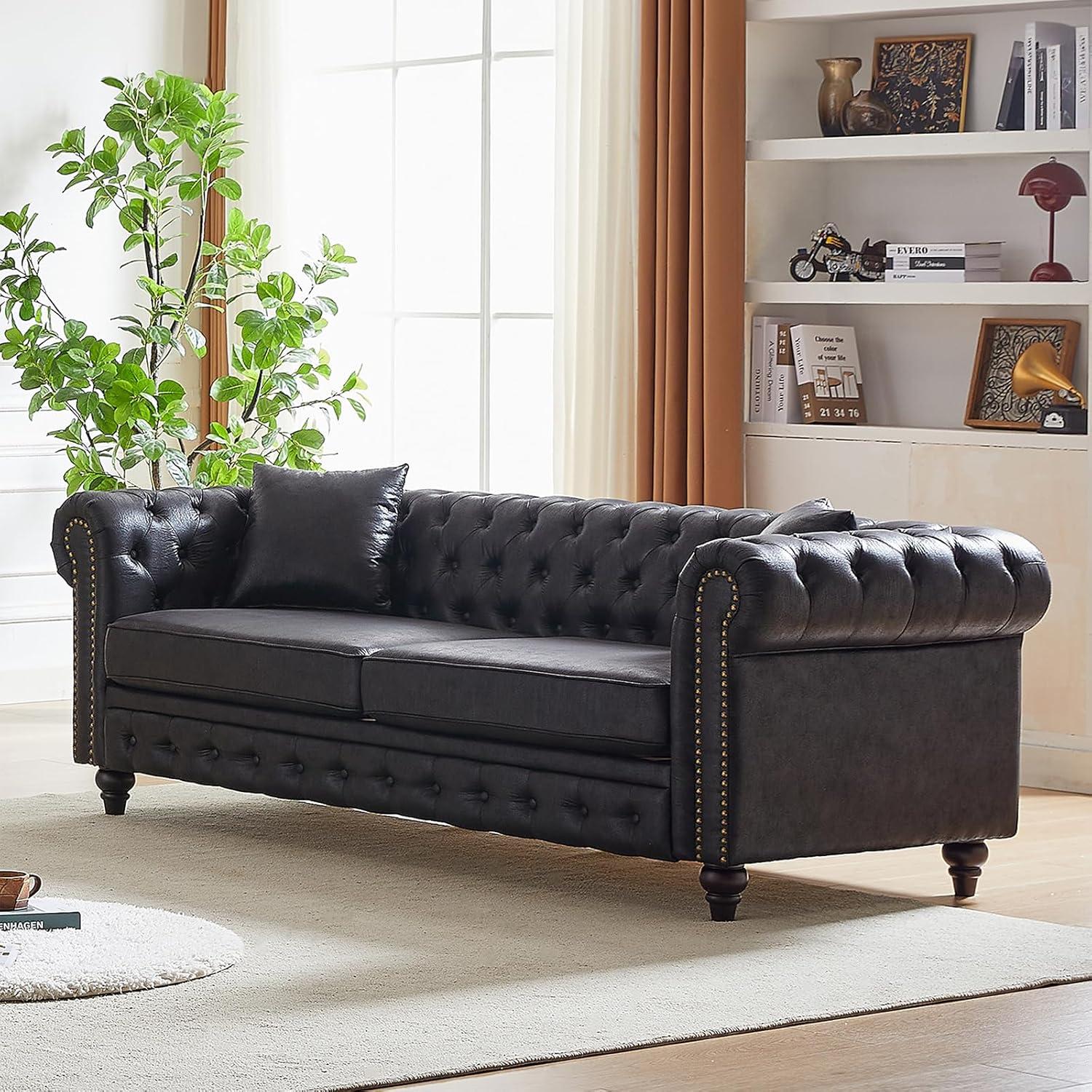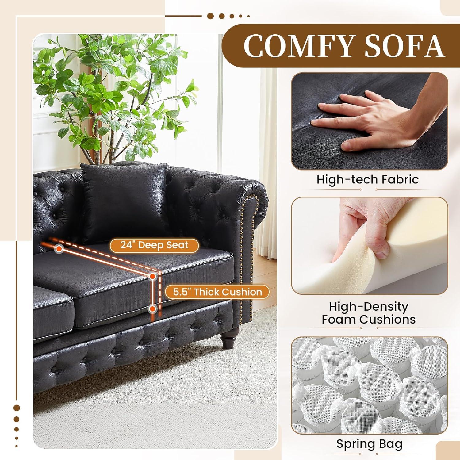 This sofa set blends effortlessly into a variety of interiors, from cozy living rooms to professional office settings. Thanks to its classic mid-century Chesterfield design with tufted deep buttons, nailhead trim, and elegant rolled armrests, it adds a timeless, luxurious charm without overwhelming the space. The sleek black high-tech fabric enhances versatility, complementing décor styles ranging from modern minimalism to vintage sophistication. In living rooms, its 24-inch deep seats and generous armrest widths create inviting, spacious seating perfect for family gatherings or solo relaxation. Simultaneously occurring, in office lounges or reception areas, the set stands out as both comfortable and impressively stylish, effortlessly balancing professional ambiance with a welcoming tone.