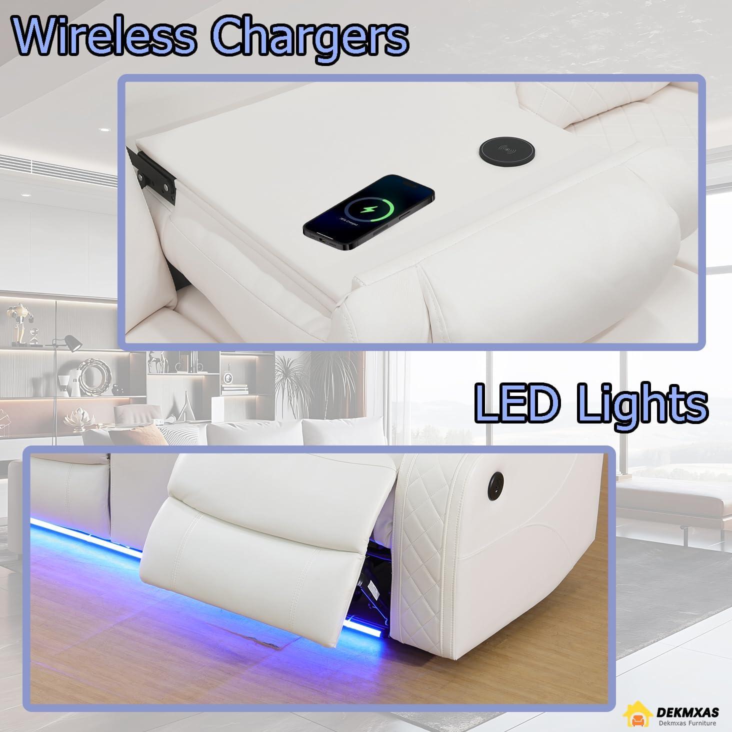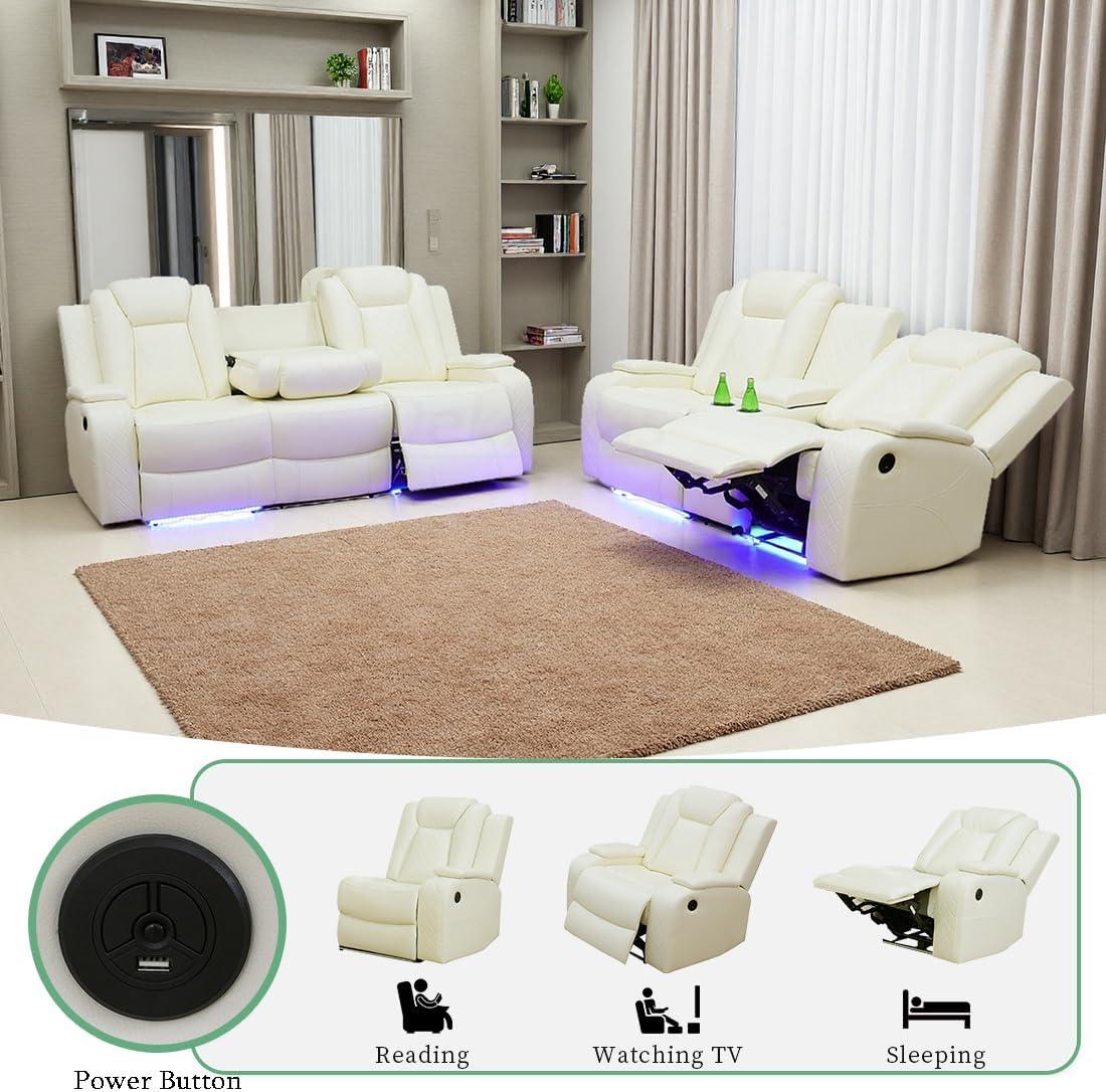 This reclining sofa set brings a versatile touch to multiple living spaces,easily adapting to both spacious and more compact rooms.Thanks to the careful sizing-with the sofa measuring 83.5″W, loveseat 73.5″W, and chair 37.5″W-it effortlessly balances presence and practicality. the neutral vanilla white leather helps it blend seamlessly with different color schemes and décor styles,while the LED lighting beneath the seats adds a modern ambiance that enhances rooms both day and night. Whether positioned as the focal point in an open-plan living room or nestled comfortably into a cozy family nook, its manual reclining feature and integrated storage bring function without compromising style.