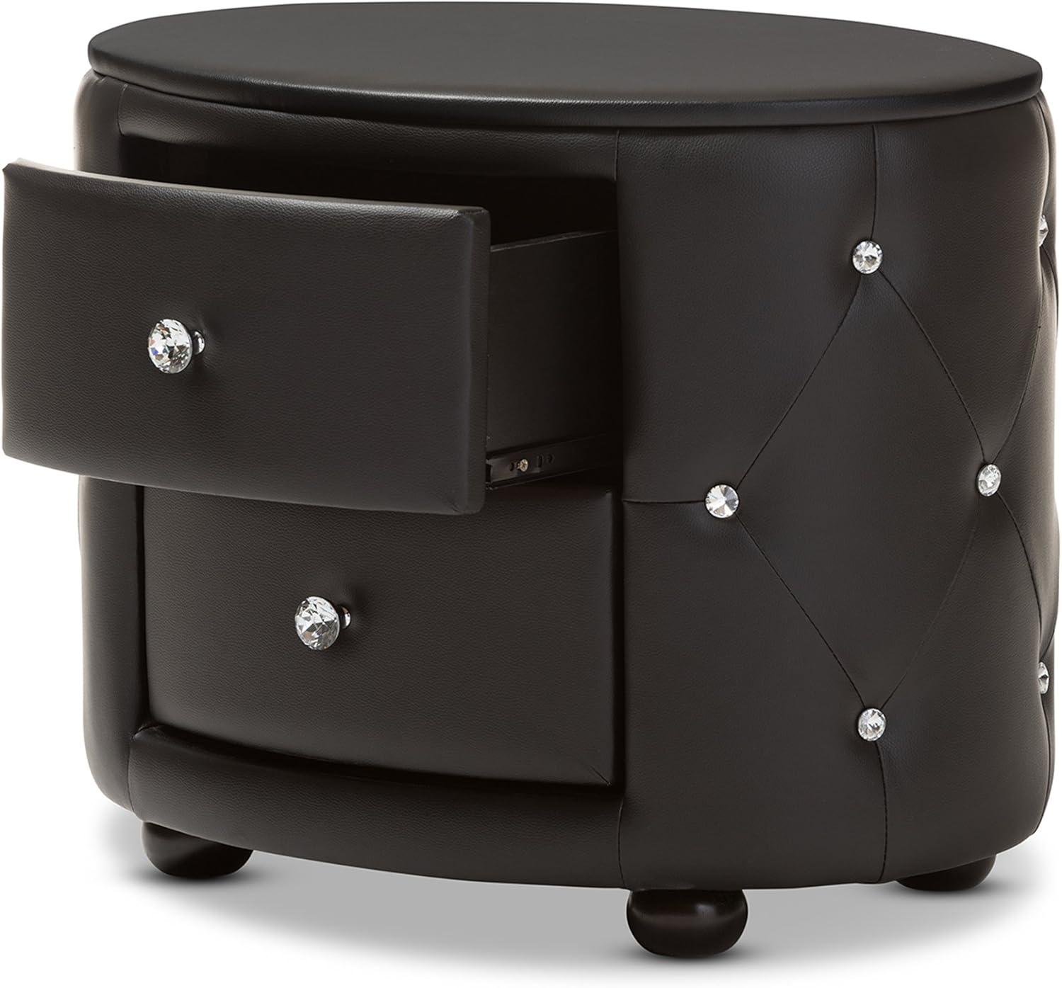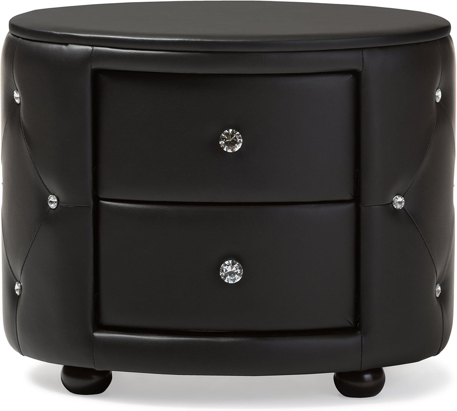 This nightstand perfectly captures the essence of Hollywood glamour, bringing a sophisticated yet modern flair to any bedroom. The sleek black faux leather upholstery, complemented by tufted faux crystal buttons, provides a luxurious tactile and visual experience. Its oval silhouette and rounded wooden legs create a soft, inviting aesthetic, while the two spacious drawers offer practical storage for bedside essentials. Constructed from solid rubberwood and plywood, it promises durability alongside its striking design. Plus, with foam padding beneath the upholstery, it adds an unexpected element of comfort to your nightly routine.