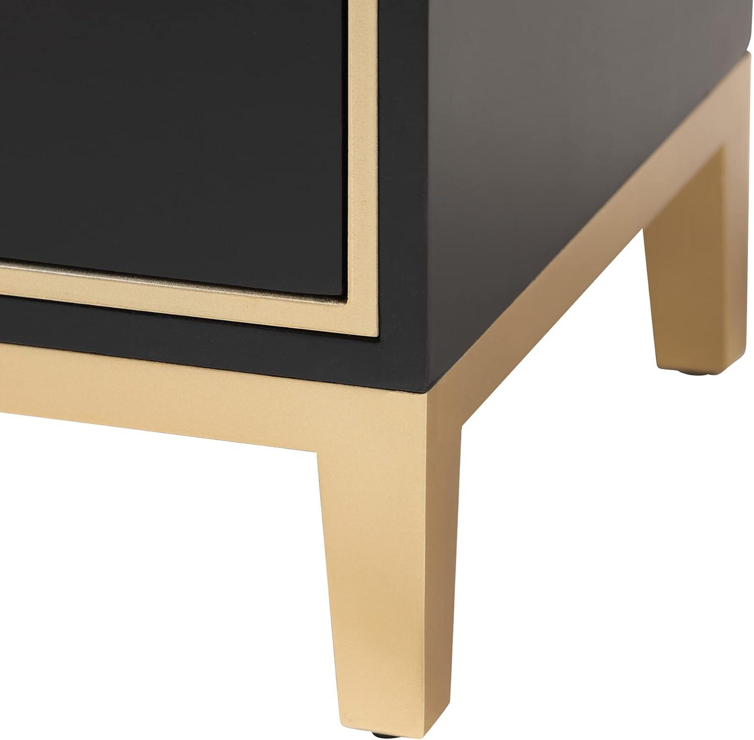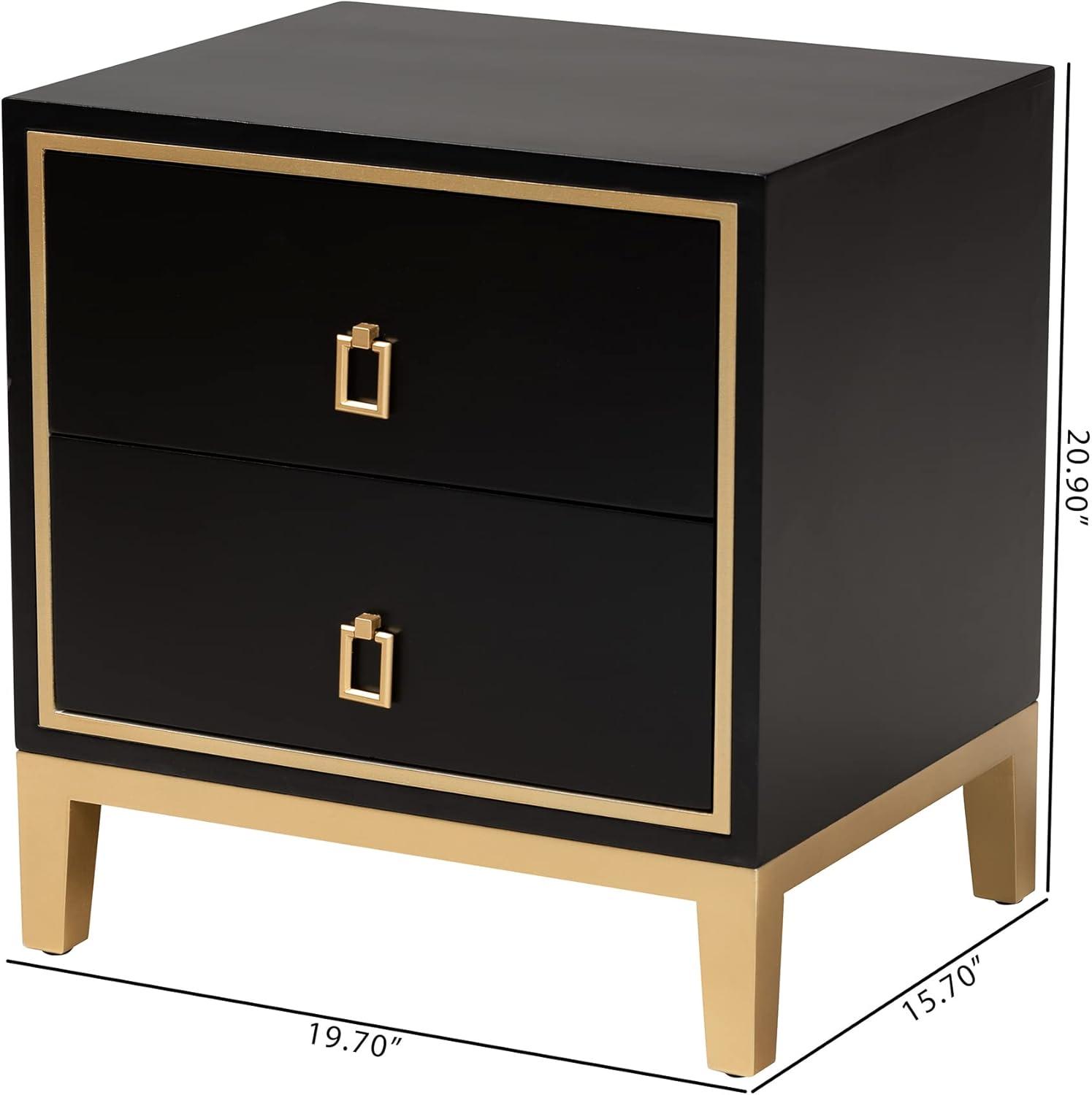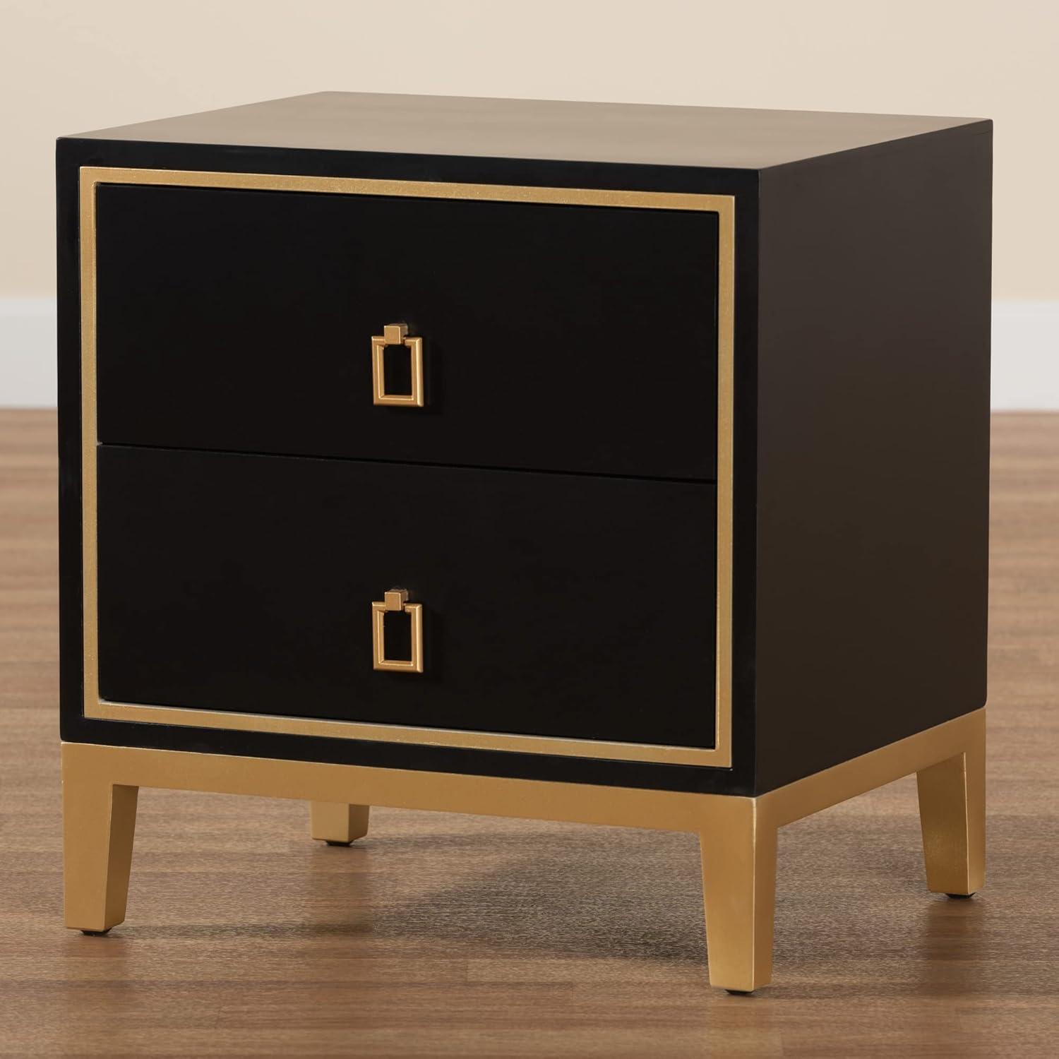 Its sleek silhouette and rich black finish accented with gold metal detailing make this piece a versatile addition for a variety of interiors. In a modern glam setting, the geometric embellishments and tapered legs bring just the right amount of understated luxury, elevating minimalist spaces without overpowering them. The two drawers provide discreet storage, perfect for stashing remotes or reading glasses in a living room or beside a stylish reading nook. Meanwhile, its subtle yet striking design also complements contemporary spaces, where clean lines and functional elegance are prized.