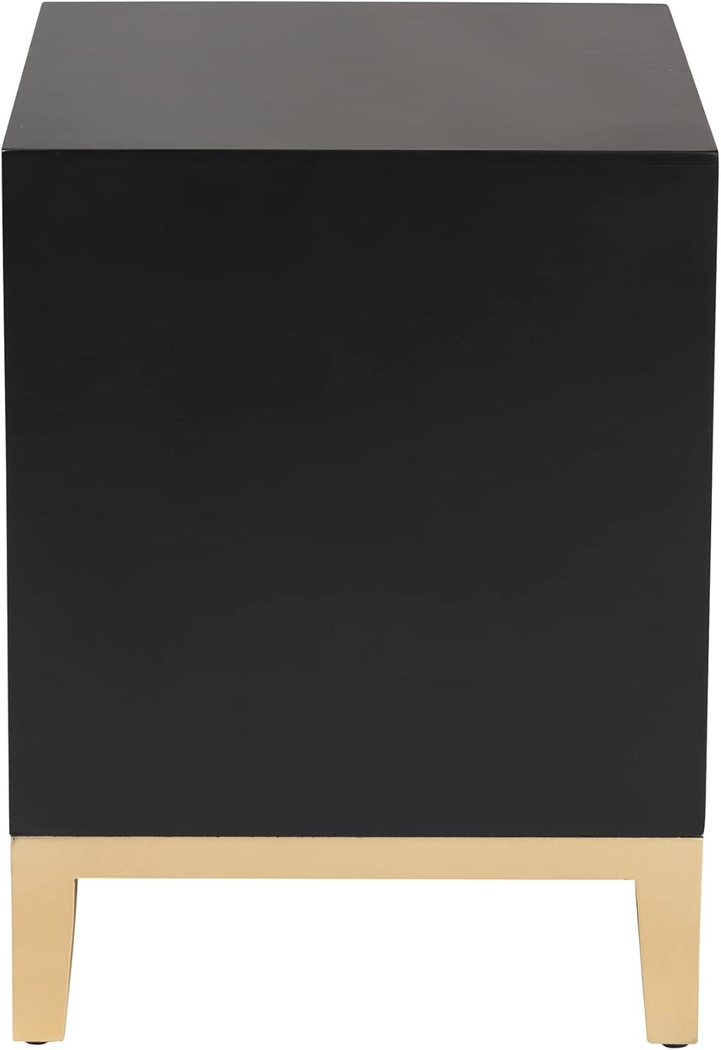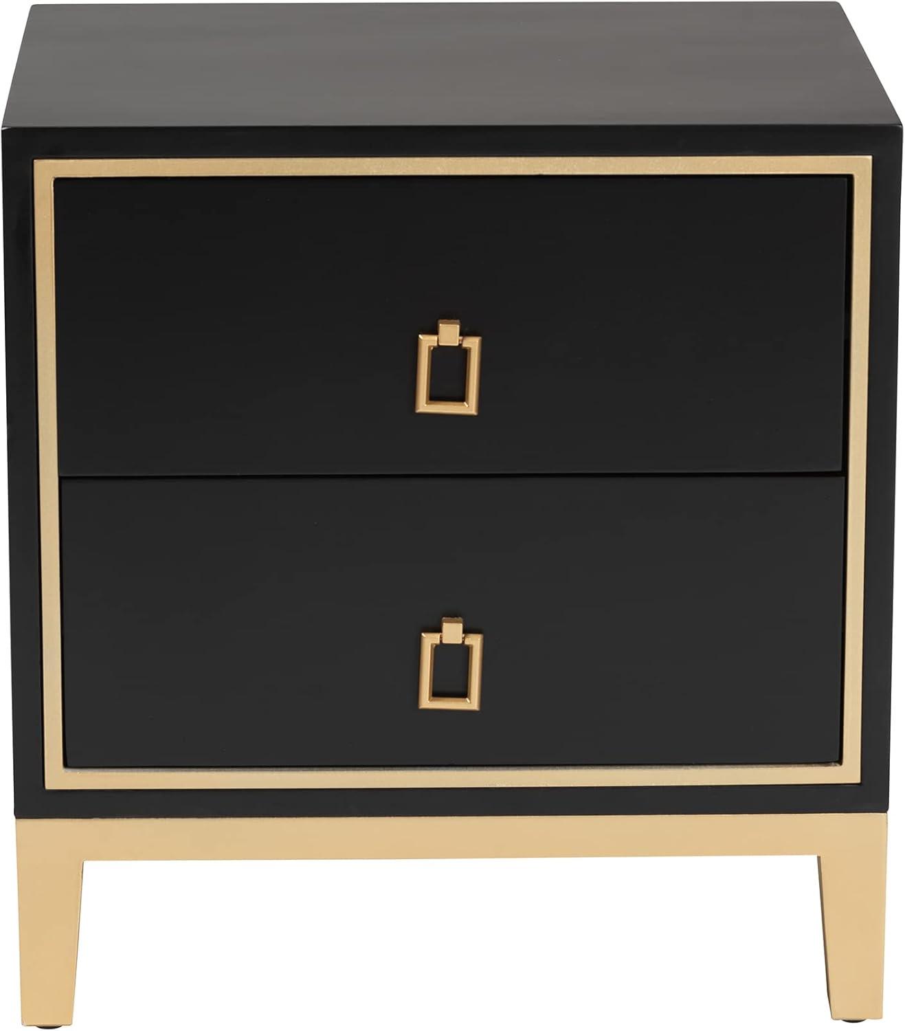 Instantly elevating any living space,this modern end table blends subtle glamour with functional design. crafted from a sleek wood frame paired with a sturdy metal base in a sophisticated black and gold finish, it strikes the perfect balance between luxe aesthetics and everyday practicality. The two spacious drawers feature rectangular pulls and geometric embellishments that add an eye-catching opulence without overwhelming the room’s decor. Its tapered legs lend an elegant silhouette, making it a standout addition whether placed beside a sofa or bed.