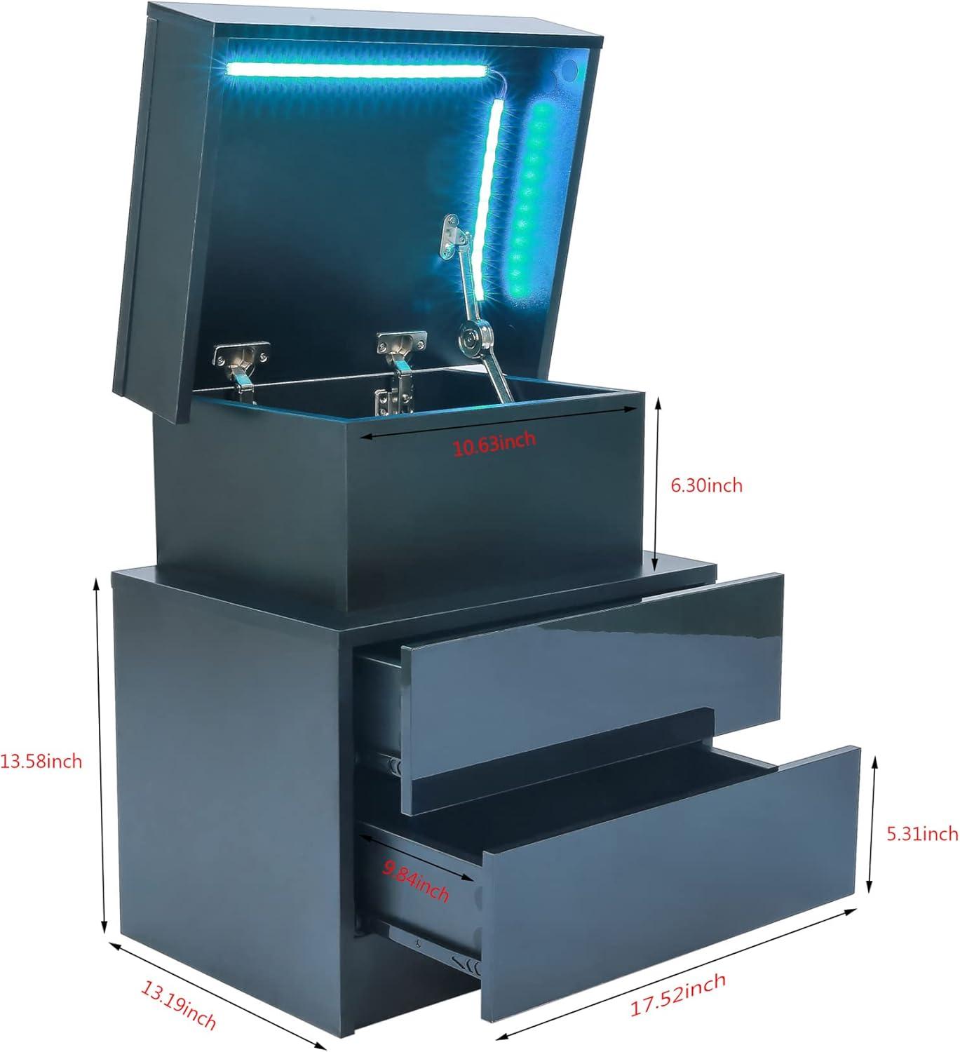 The design of these night stands stands out with a modern, minimalist aesthetic, perfectly suited for contemporary living spaces. The high gloss finish on the drawer fronts contrasts elegantly with the matte surfaces on the rest of the unit, adding visual depth without overwhelming the room.What makes the build truly innovative is the clamshell flip-top design that provides an unconventional storage option.This unique feature allows the top of the stand to open smoothly, revealing a hidden compartment, ideal for keeping personal items within easy reach yet out of sight. The overall dimensions (17.7″L x 13.8″W x 20.5″H) carve out a balanced footprint that integrates well without feeling bulky.