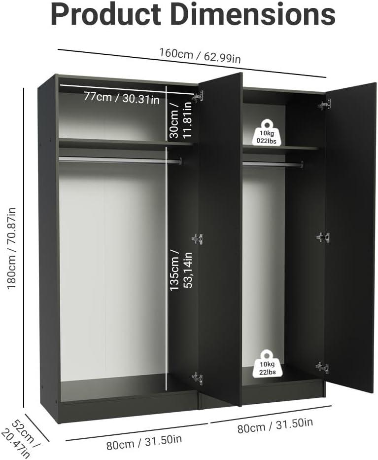functionality is clearly at the forefront, with the clever layout of four doors revealing a thoughtfully organized interior. Inside, you’ll find two upper shelves perfect for folded clothes or accessories, alongside two hanging racks built to support heavier garments like winter coats and suits comfortably. The wide compartment beneath is ideal for longer items, creating a versatile space-saving solution that adapts for both bedroom wardrobes and office storage needs. Included wall-mounting hardware adds a layer of safety and stability, reassuring us that this unit will remain firmly anchored without tipping risks.