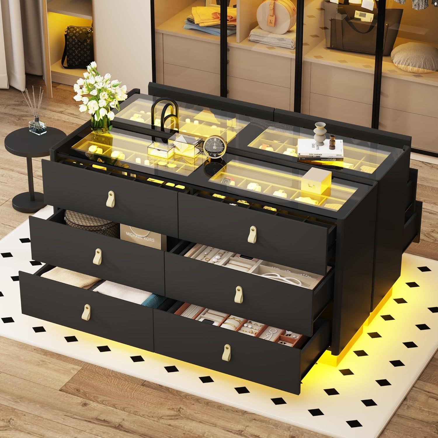 Integrating this bedroom island into our space has truly elevated our organization game. The six spacious drawers provide versatile storage options, with two dedicated jewelry compartments that perfectly house necklaces, rings, and smaller accessories, while the remaining larger drawers accommodate everything from clothing to handbags. The elegant, tempered glass tabletop adds a refined touch and offers an ideal spot to showcase special pieces or to prepare outfits, all enhanced by the soft illuminating LED lights underneath that create a warm ambiance and make finding items in low light effortless.
