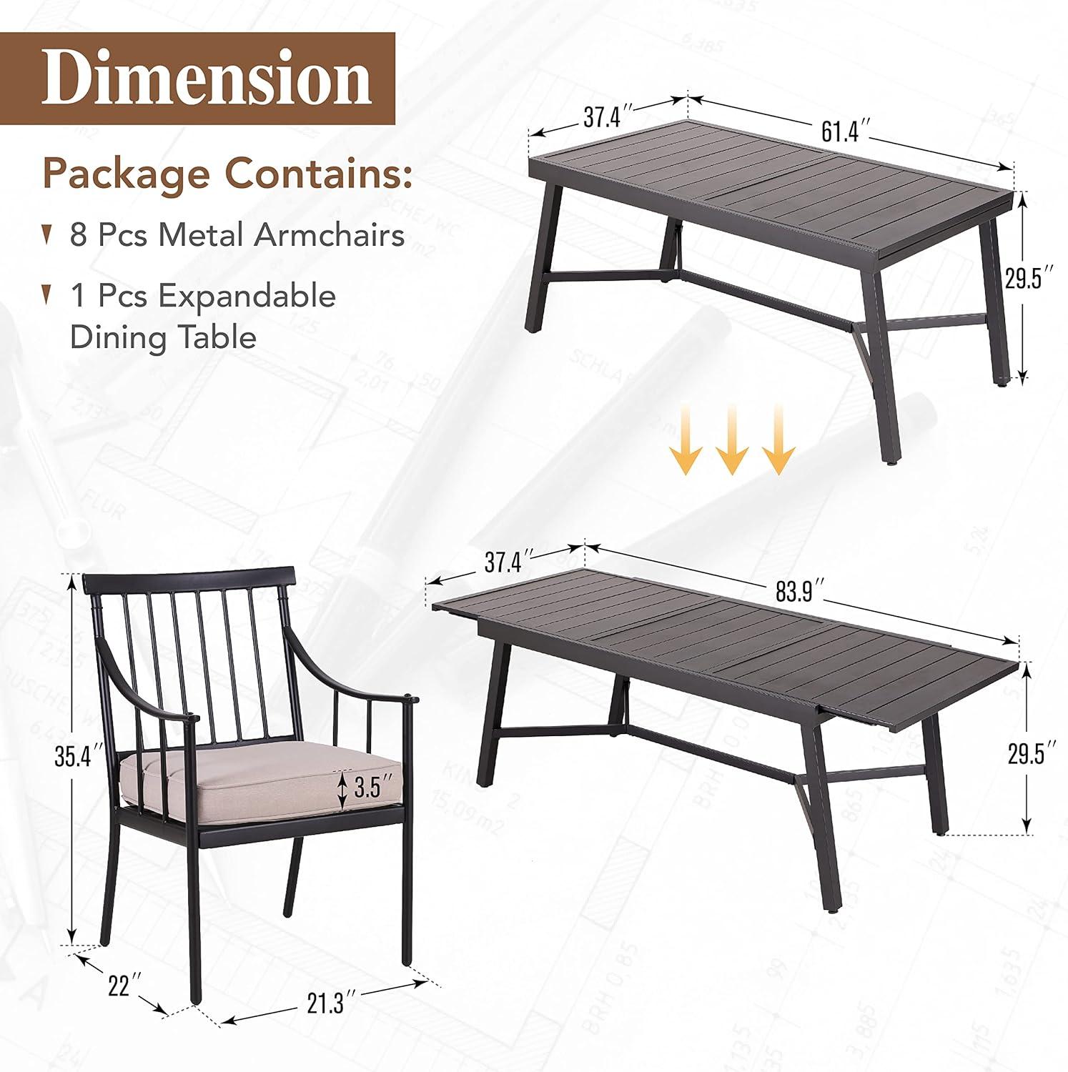 The cushions on the eight metal armchairs add a welcoming comfort without compromising on weather resistance. Their ergonomic design-with curved backs and armrests-supports long, comfortable seating sessions, perfect for family meals or pleasant get-togethers. Each chair supports up to 300 lbs, assuring sturdy usage for most guests. We were also impressed by the attention to detail such as breathable sponge cushions in olefin fabric, which are both comfortable and easy to clean. this set brings together durability, comfort, and versatile functionality, making it a compelling choice for any yard, deck, or garden.