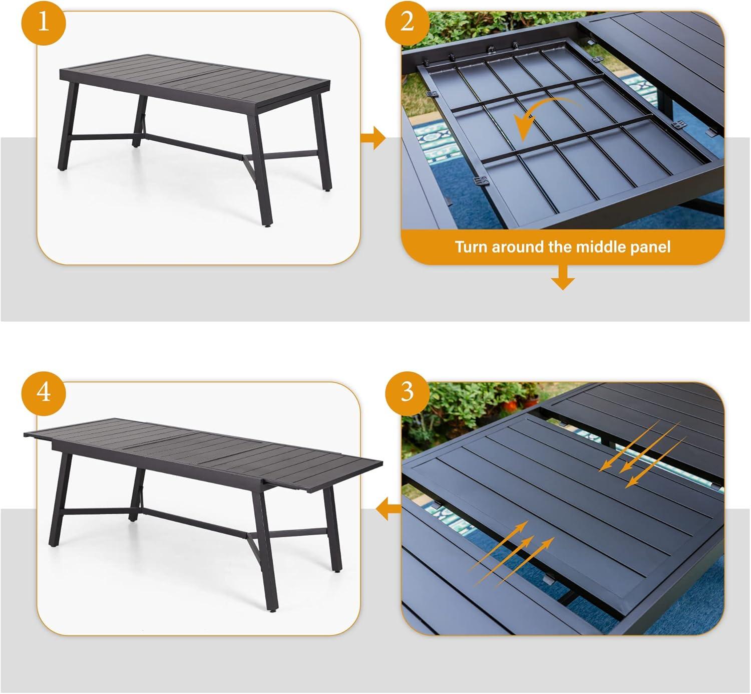 Upon unpacking this patio dining set, we immediately noticed the quality craftsmanship and thoughtful design tailored for outdoor enjoyment.The set includes a spacious rectangular table that expands from 61.4 inches to nearly 84 inches, allowing adaptability for seating between 4 to 8 people. This expandability is an excellent feature for gatherings of varying sizes, and the mechanism to tuck away the leaf plate when not in use helps to save space gracefully. The powder-coated steel frame feels robust and well-made, promising durability against the elements such as rain, wind, and even snow. Assembly was straightforward, with all necessary tools and clear instructions included, making setup hassle-free.