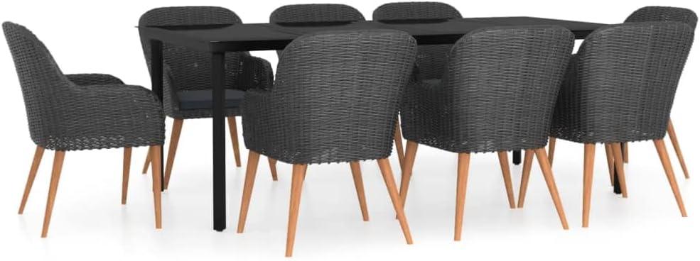 Our outdoor space instantly transformed with the introduction of this sleek dining ensemble. The modern rectangular table paired with the two-tone cushions brings a sophisticated yet cozy atmosphere, perfect for those leisurely brunches or lively family dinners. The black poly rattan weave and dark grey cushion palette blend seamlessly with our natural surroundings, adding a touch of elegance without overpowering the garden’s charm. It’s this balance of style and comfort that defines our weekend hangouts, inviting everyone to relax and enjoy the fresh air alongside great food.
