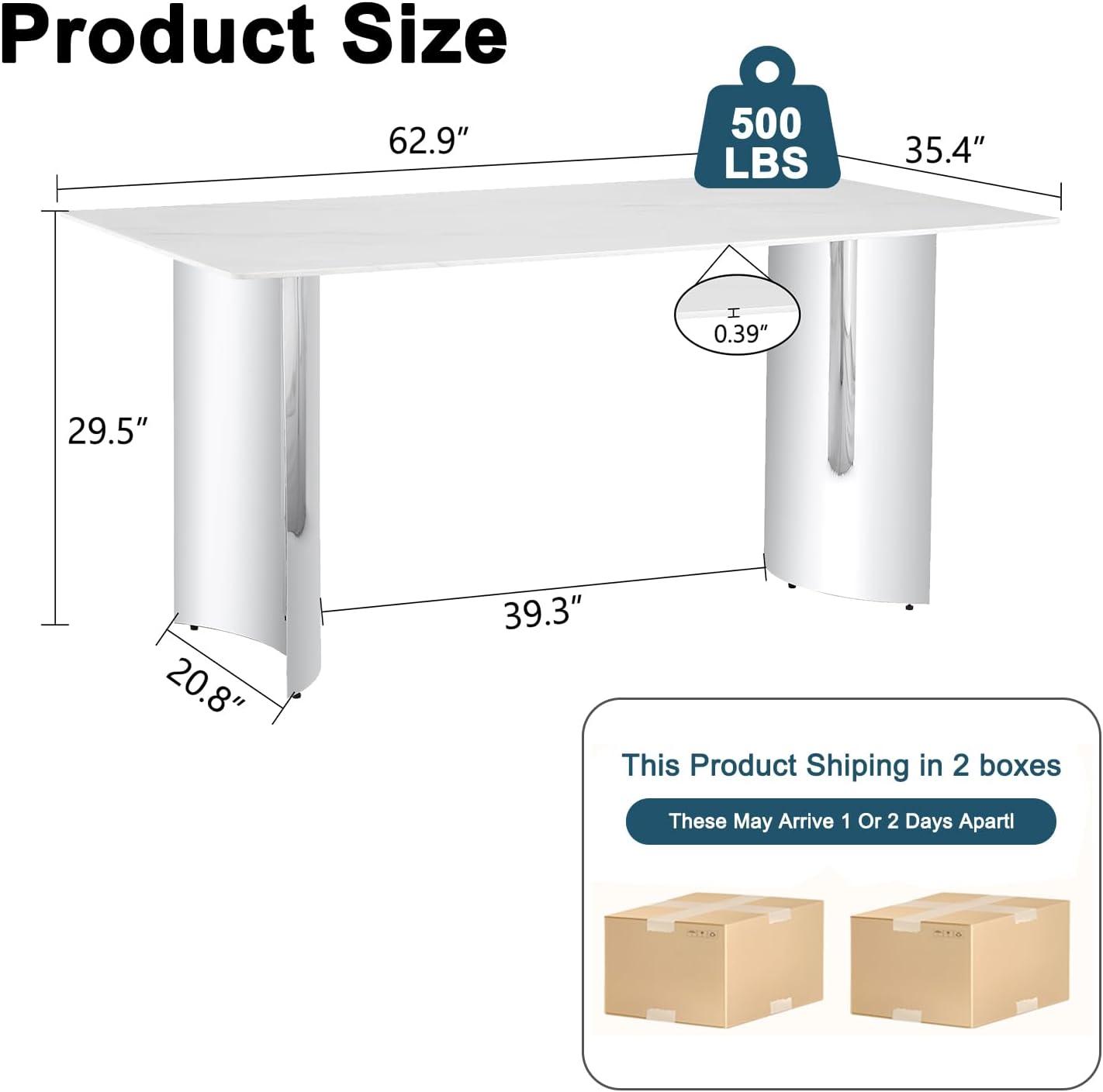 Our table’s sleek marble-patterned glass top paired with a chrome-plated stainless steel base makes it a versatile centerpiece that effortlessly elevates various environments. in a modern kitchen or dining room, its minimalist white finish brightens up the space, complementing both bold and subtle color schemes. Its 63-inch length and ability to seat 4-6 people provide an ideal setting for intimate family dinners or casual gatherings with friends. Simultaneously occurring, in a home office or creative studio, the smooth tempered glass surface offers ample space for collaborative meetings or brainstorming sessions, adding a touch of elegance without overwhelming the room.