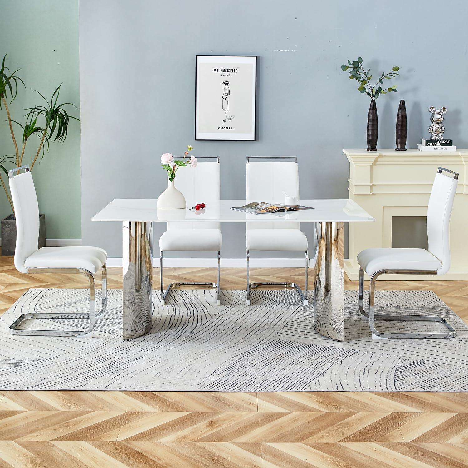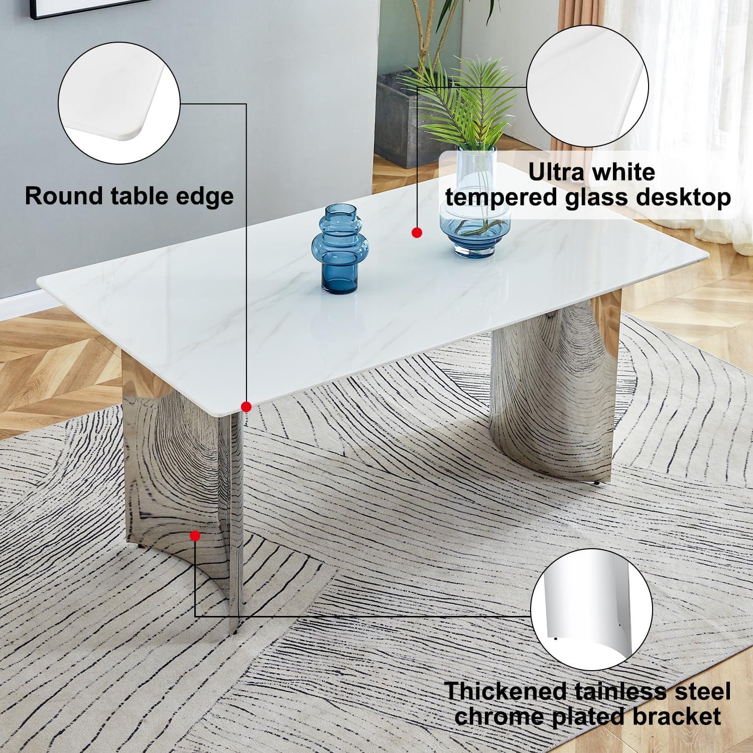 We find this dining table strikes an excellent balance between stylish design and practical functionality, making it a solid investment for daily living. The minimalist white tabletop with its marble-effect glass surface not only enriches any space with a refined aesthetic but also offers remarkable durability. Its scratch-resistant, high-temperature-resistant glass easily handles everything from casual meals to more formal gatherings without worry. The sturdy chrome-plated stainless steel base paired with solid wood supports ensures stable use even during lively family dinners or friendly get-togethers. Assembly is straightforward but best done with two people, and the well-thought-out simplicity saves us time and effort, so it fits seamlessly into our busy routines.