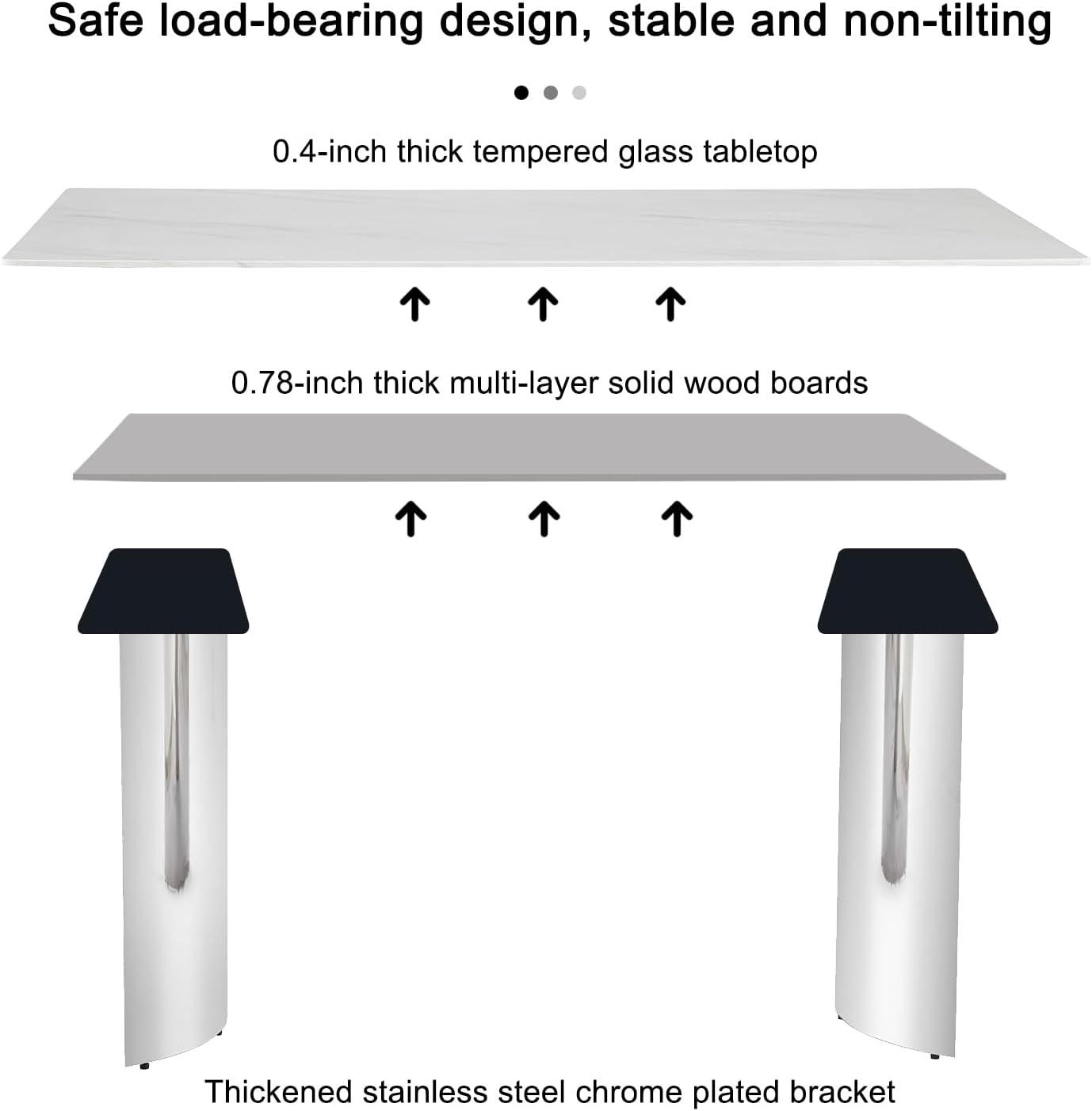 From the moment we unpacked this sleek and stylish table, its design impressed us. The minimalist snow-white surface, enhanced with a marble-look glass finish, radiates a subtle elegance that effortlessly elevates any space. What truly stands out is the combination of tempered glass and solid wood support panels beneath, ensuring remarkable stability – even on uneven floors, the table remained rock steady without a hint of wobble. The chrome-plated stainless steel base, finished with a glossy vacuum plating process, adds a modern touch that complements not only kitchens but also dining rooms, home offices, or even commercial settings like cafes.