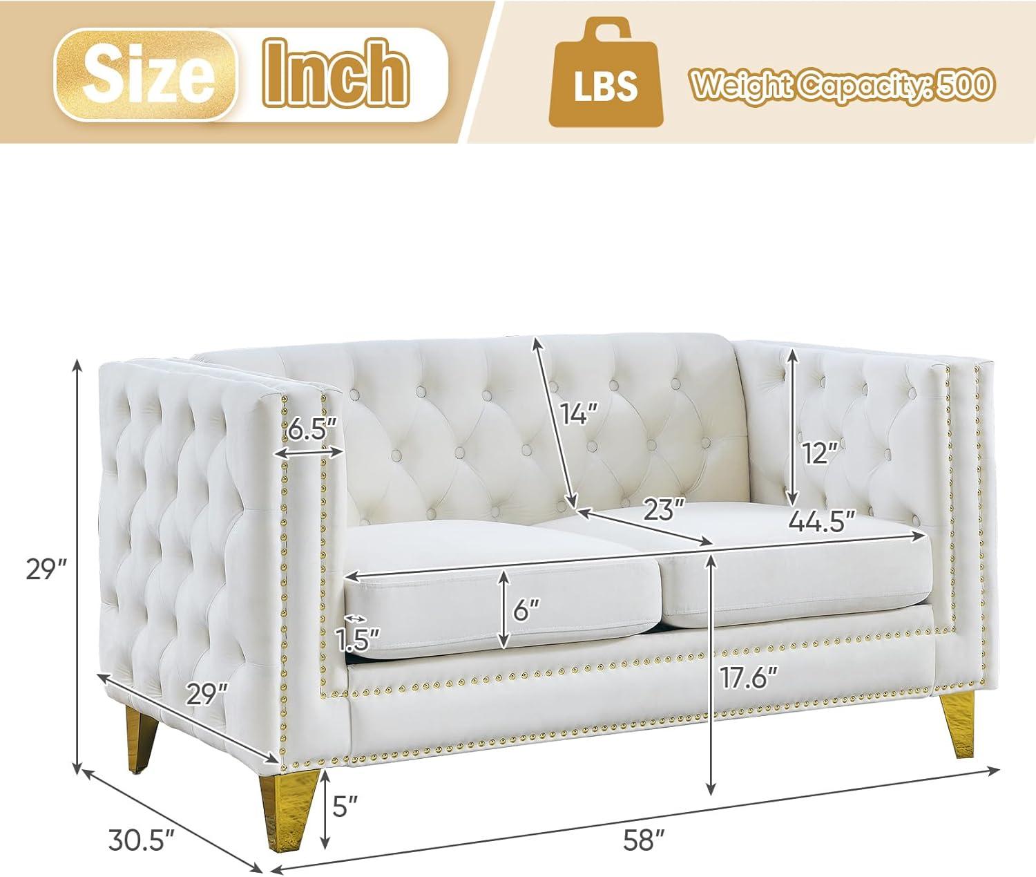 To create a balanced and inviting atmosphere around this velvet sofa set, we recommend pairing its warm beige tone with soft neutrals and subtle pops of color. Think of muted creams, light greys, or blush pink accents in throw pillows and area rugs, which complement the sophisticated tufted back and golden rivet detailing beautifully.Incorporating natural textures like a jute rug or wooden coffee table enhances the modern look while keeping the space cozy. The sleek golden legs call for metallic touches in decor items such as lamps, picture frames, or decorative trays, helping to draw the eye and tie the room together harmoniously.