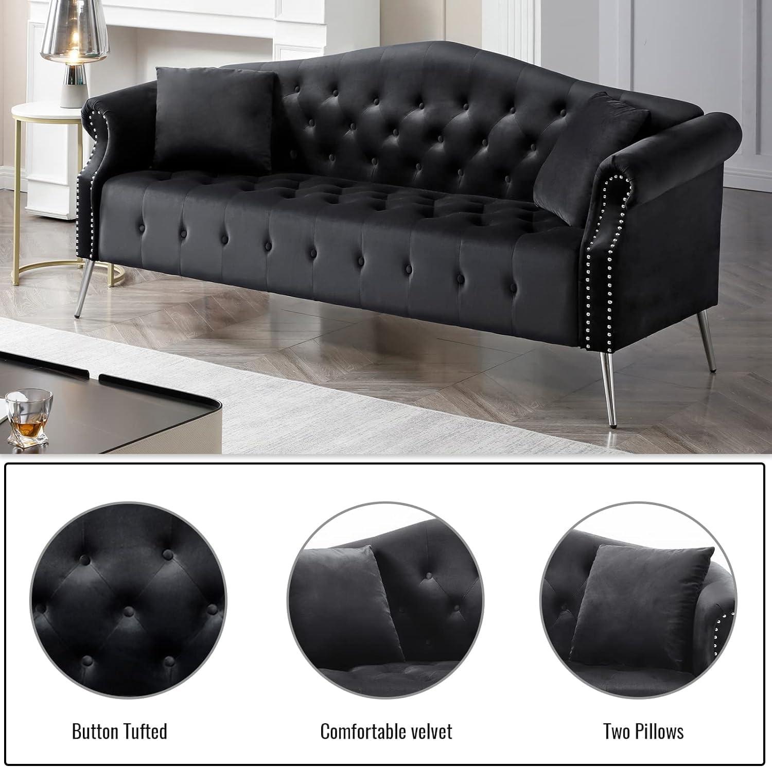 Featuring a ‌stunning blend of retro charm and⁤ modern elegance, this velvet ⁢sofa ⁣commands attention with its meticulously crafted ⁣details. The button ‍tufting and individually applied nailhead⁣ trim highlight its classic Chesterfield inspiration,while the rolled arms and gracefully curved backrest enhance its inviting‍ silhouette. Draped in soft,rich black velvet,the piece adds a luxurious‍ texture that elevates any living space,whether it’s⁢ a cozy apartment or a stylish office. Silver metal legs not onyl provide sturdy ‌support but also incorporate sleek ‌anti-scratch pads, making ⁢the sofa ⁤both durable and floor-friendly.