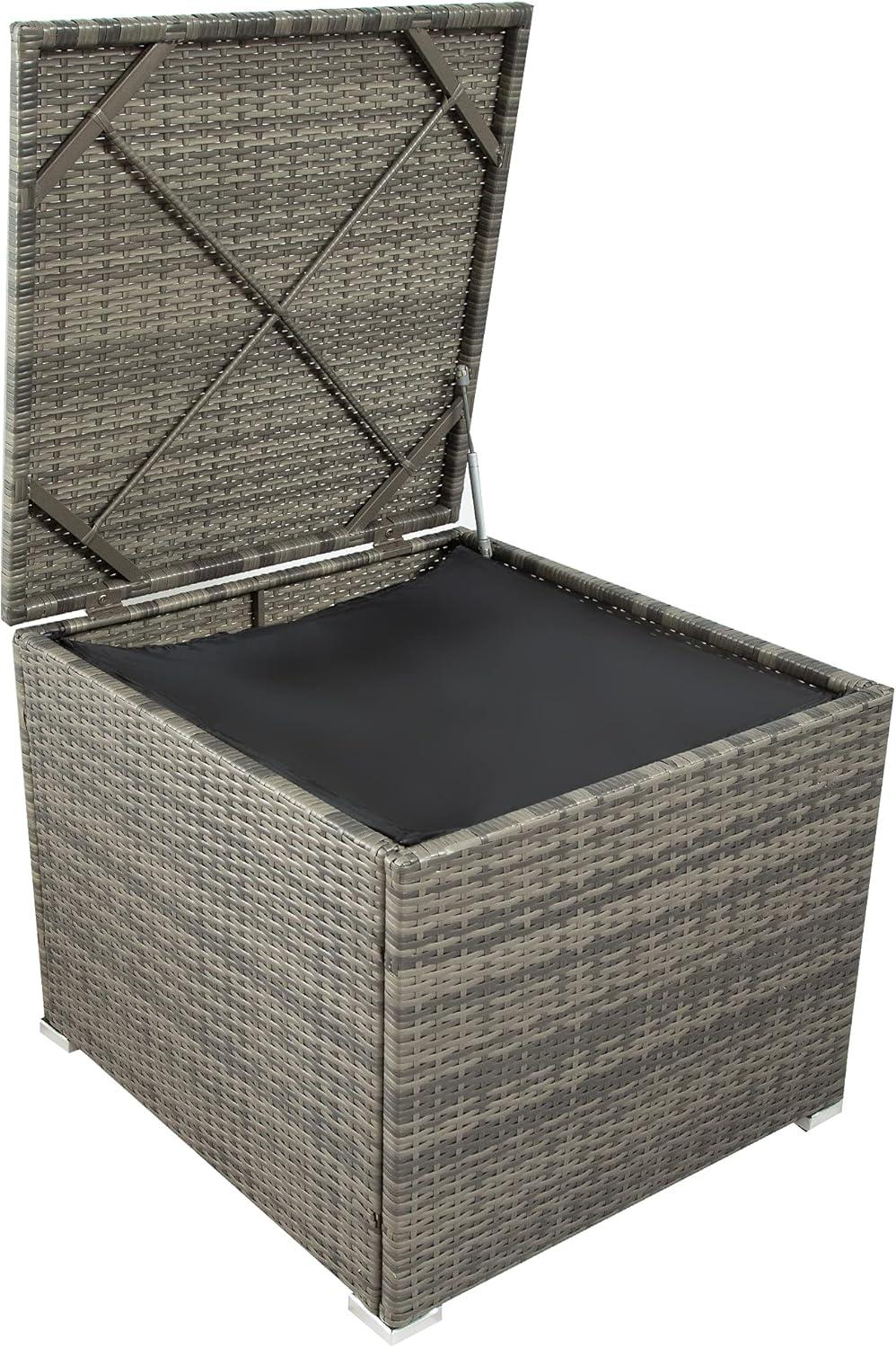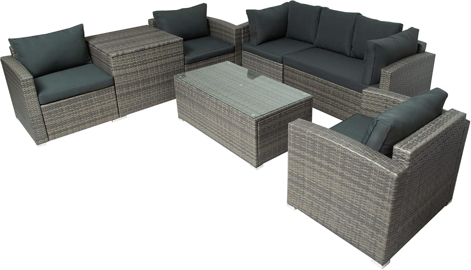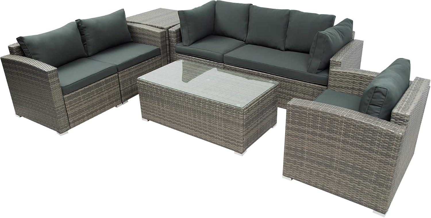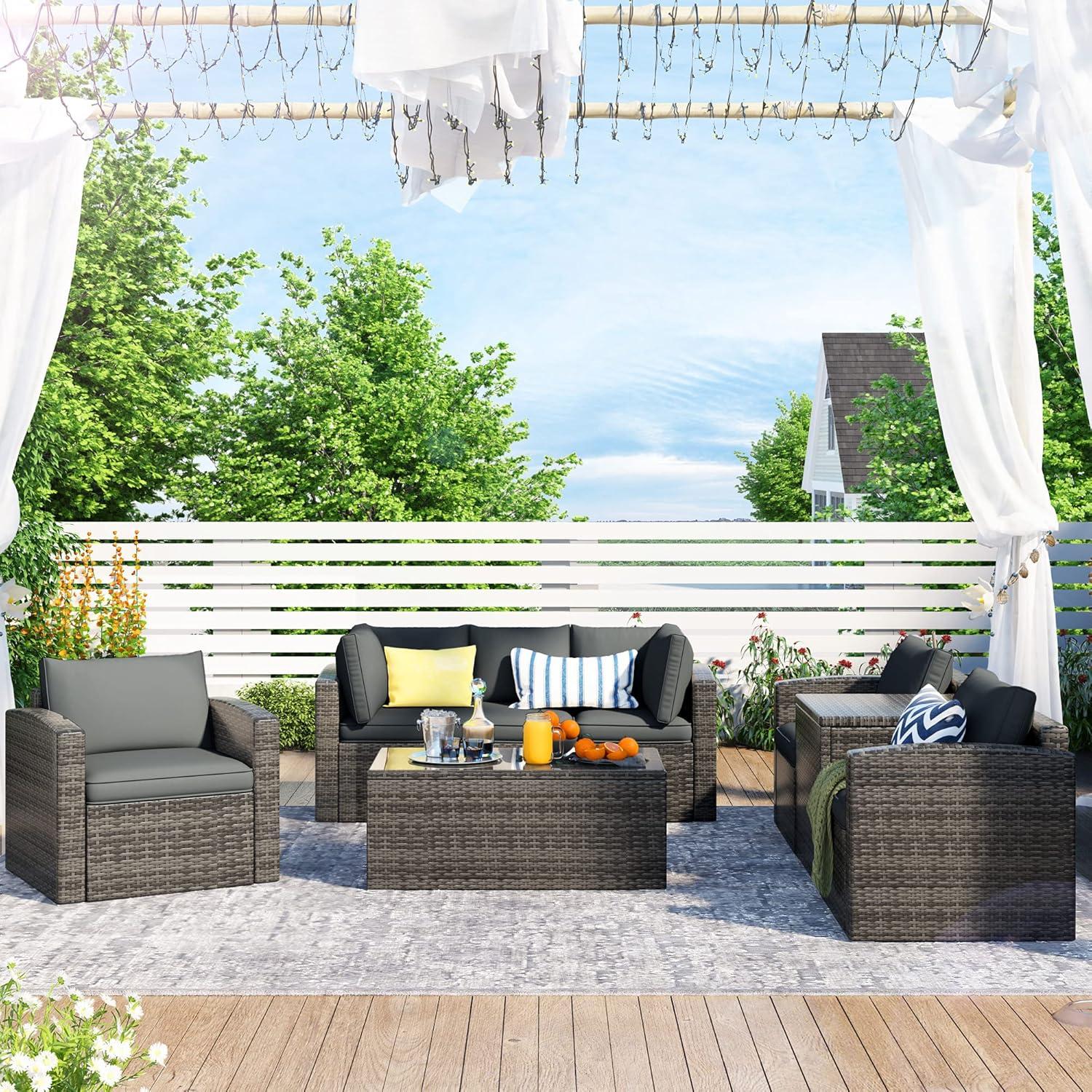 When you first step onto the patio and take in the arrangement, the set reads like a intentional island: low, spread-out seating surrounding a rectangular glass surface. The gray wicker catches light in banded highlights, and from a short distance the weave looks tight and regular; up close you’ll notice small variations where strands cross and where the frame shows through at the corners. The tempered glass top reflects sky and plantings, producing soft flashes as you move around it, while the storage box sits flush with the other pieces so the whole grouping reads as one unit rather than separate bits.