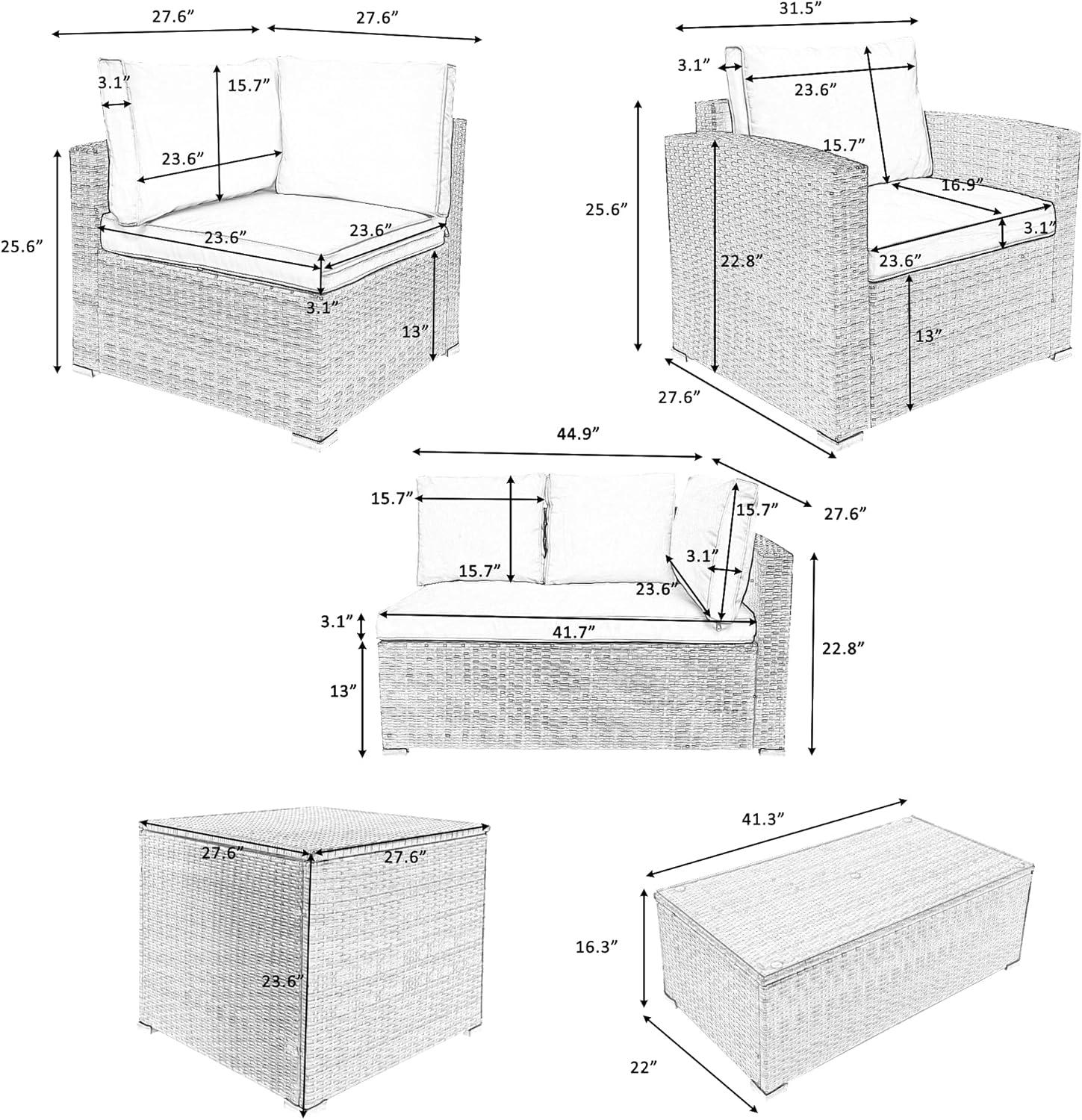 after months of regular use,the Outdoor PE Wicker Furniture Set 7 Pieces Patio Garden Conversation Cushioned Seat Couch Sofa Chair Set with Cushion Outdoor Sectional Sofa with Storage Box,Tempered Glass Coffee Table (Gray) (Grey) has a quieter presence; cushions hollow where elbows rest and the glass top wears a faint ring from mugs and pots. In daily routines the arrangement nudges the traffic of the room — a place for morning light, a patch for reading, a spot where friends drift toward — and the seating’s give changes with those rhythms.Surface scuffs and softening fabric become part of how the space reads, the storage box filled with the small, usual things of the household. Over time it simply stays.