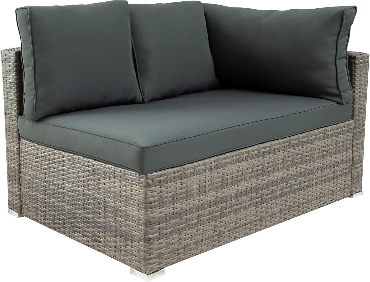 Get close enough and the woven PE strands read like a pattern of fine braids. When your fingertips follow an armrest or the back, you notice alternating ridges where each strand crosses another and tiny V-shaped channels that hold dust or morning dew. The surface feels slightly slick where the synthetic fibres catch light and a little springy if you press hard; the weave can give a fraction before the underlying structure takes the load. Up close the color isn’t perfectly uniform — highlights and shadow from the strands make the grey look variegated as you move around it.