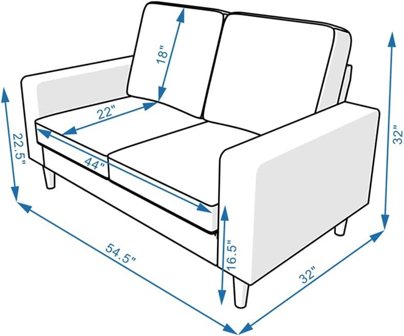 Our experience with this compact, modern fabric sofa has been largely positive. The design instantly caught our eye with its elegant paneled back and streamlined armrests, effortlessly adding a refined touch to our living space. Despite its modest 2-seater size, it feels surprisingly spacious, thanks to thoughtful dimensions that balance comfort and practicality.At 54.5″ long and 32″ deep, it fits perfectly in our small apartment without overcrowding the room.The seating depth of 22″ and a height of 16.5″ offer just the right firmness, making it a cozy spot for both lounging and casual conversation. Assembly was smooth and hassle-free,with all hardware and tools included in two manageable packages,saving time and frustration.