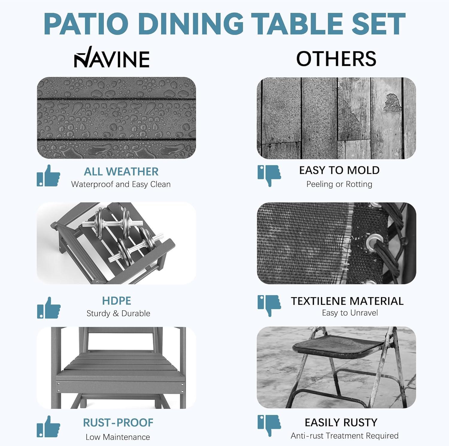 After a few months, the Patio Dining Table set for 6, 7-Piece Patio Table and Chairs Set, HDPE All Weather Outdoor Furniture Set with Umbrella Hole, Suitable for Lawn, Garden, Backyard, Poolside in grey has folded itself into the daily shape of the yard, appearing more in small habits than as a new arrival.Over time chairs are pulled out and nudged back at different heights, cushions soften where they are sat, and the table surface picks up faint marks that match evenings and quick breakfasts in daily routines. As the outdoor room is used, the umbrella becomes an ordinary presence and conversations move around the set in the low rhythm of regular household habits. it stays.