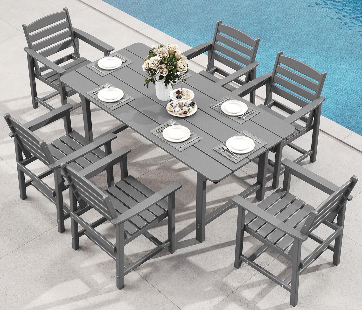 Late afternoon light picks out a soft, muted grain across the gray Patio Dining Table Set for 6 (an unbranded listing), and at first glance the group reads as quietly considerable rather than flashy. You find the tabletop’s matte HDPE surface pleasantly cool under your hand, while the slanted chair backs and rounded armrests settle you into a surprising, relaxed silhouette — six seats that hold their shape without looking bulky. Small practical touches — the umbrella hole, the reinforced join were top meets legs — catch your eye as ordinary, lived-in details in an everyday backyard scene.
