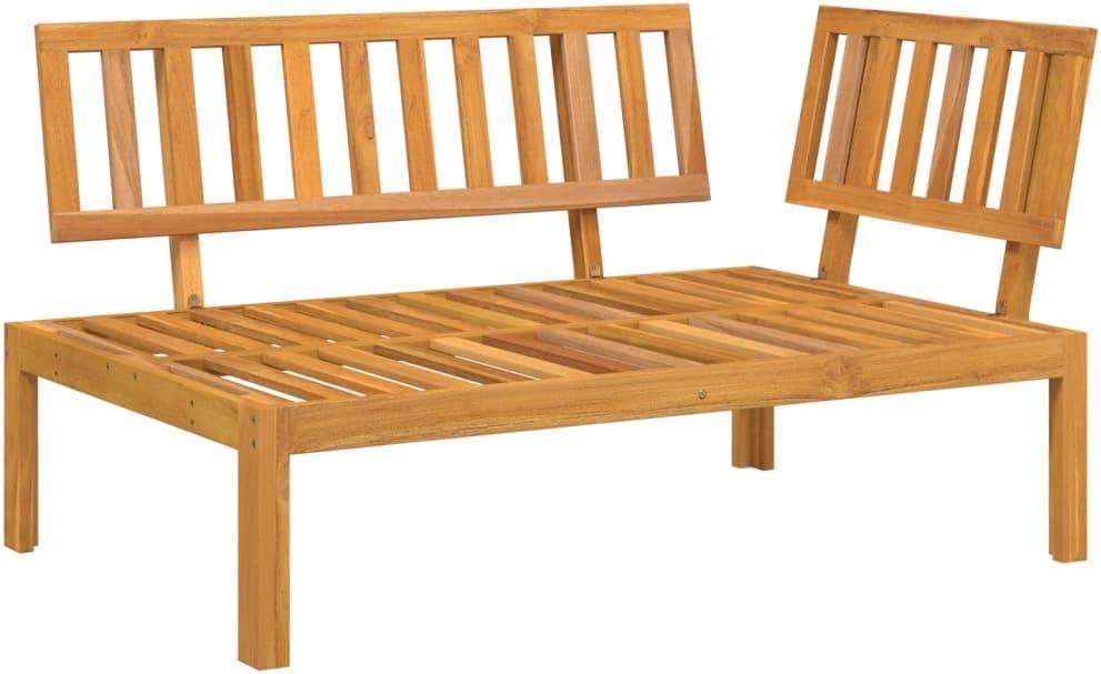 the frame is built from solid acacia, a dense tropical hardwood noted for its visible grain and natural color variation. The construction uses a slatted platform and backrest arrangement that both reduces weight and allows airflow beneath padding; these slats are joined to thicker perimeter rails and cross-members to form the corner module. The exposed surfaces carry an oil finish, which seals the timber pores and accentuates the grain while providing a degree of moisture resistance appropriate for outdoor exposure. You can also observe mechanical fastenings and recessed joinery where load-bearing contact points meet—legs and lateral supports are tied into the main frame to distribute stress across multiple members rather than a single screw or bolt. Practical details to note: