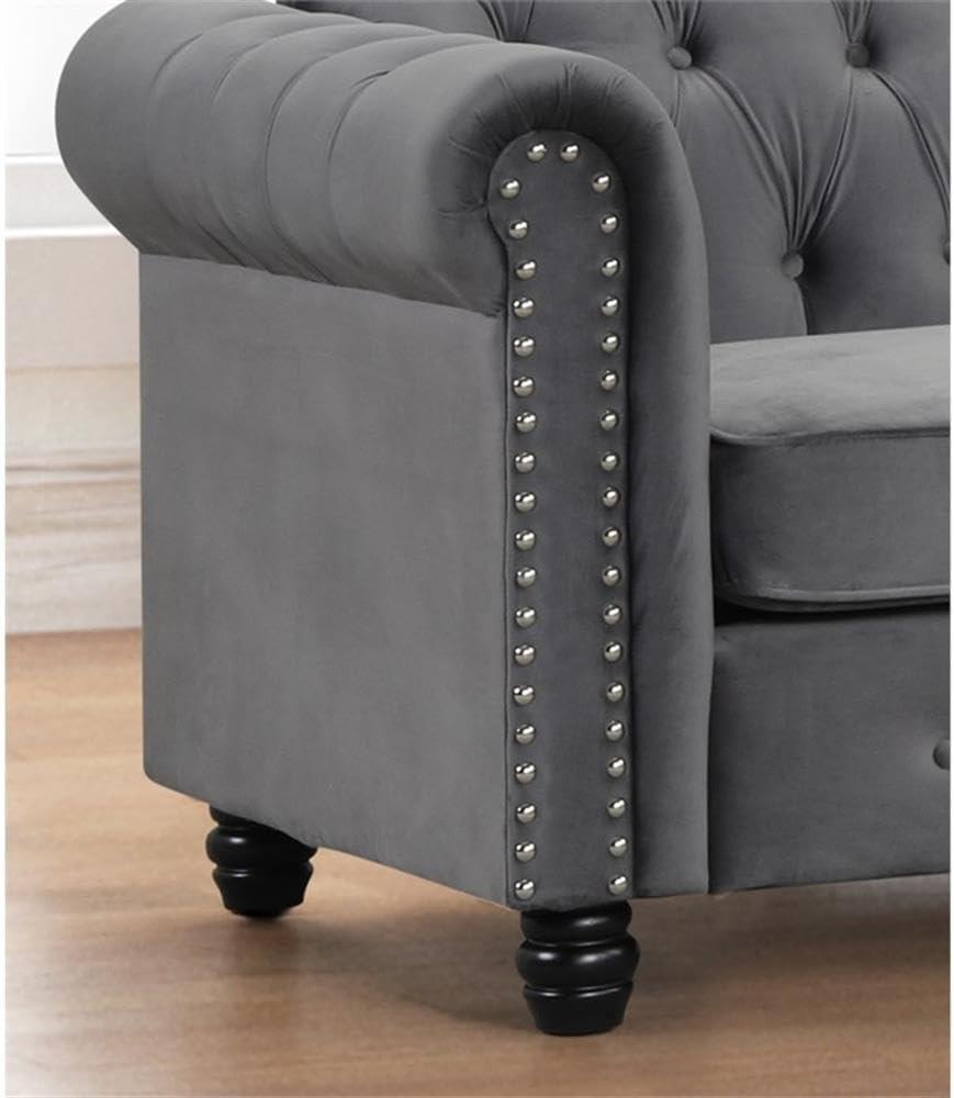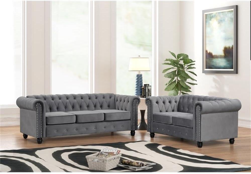 Light skims across the grey velvet of the Pemberly Row Modern Sofa loveseat Velvet Fabric Living room Furniture Set-Gray as it settles into the room. You first register the pair by sight: low, wide silhouettes that carry some visual weight but still let the floor breathe around them. Run your hand along a cushion and the fabric feels cool and dense, the pile shifting slightly under your palm; press down and the seat answers with a measured, springy give. The black wooden legs are unexpectedly slim against that plush surface, grounding the pieces without making them look heavy. From a few steps away the set reads calm and considered,the kind of presence that quietly defines the room rather than demanding it.