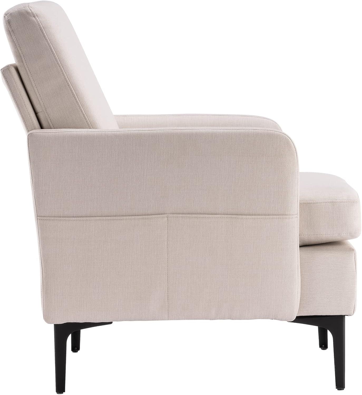 Light skims across the woven linen of the pvillez Accent Chair, picking out a subtle texture you notice when you brush the arm with your palm. Up close the fabric feels slightly coarse and forgiving, and the seat gives a fast, springy welcome as you lower yourself. The silhouette is modest—a rounded back and low arms that read smaller than a sofa but deeper than a dining chair—so the piece sits in the room without shouting. Slender metal legs lift the form and keep the visual weight light, while a faint hint of wood beneath the upholstery feels reassuring when you shift. After a few minutes, the chair reads like a lived-in object: tactile, quietly present, and immediately familiar.