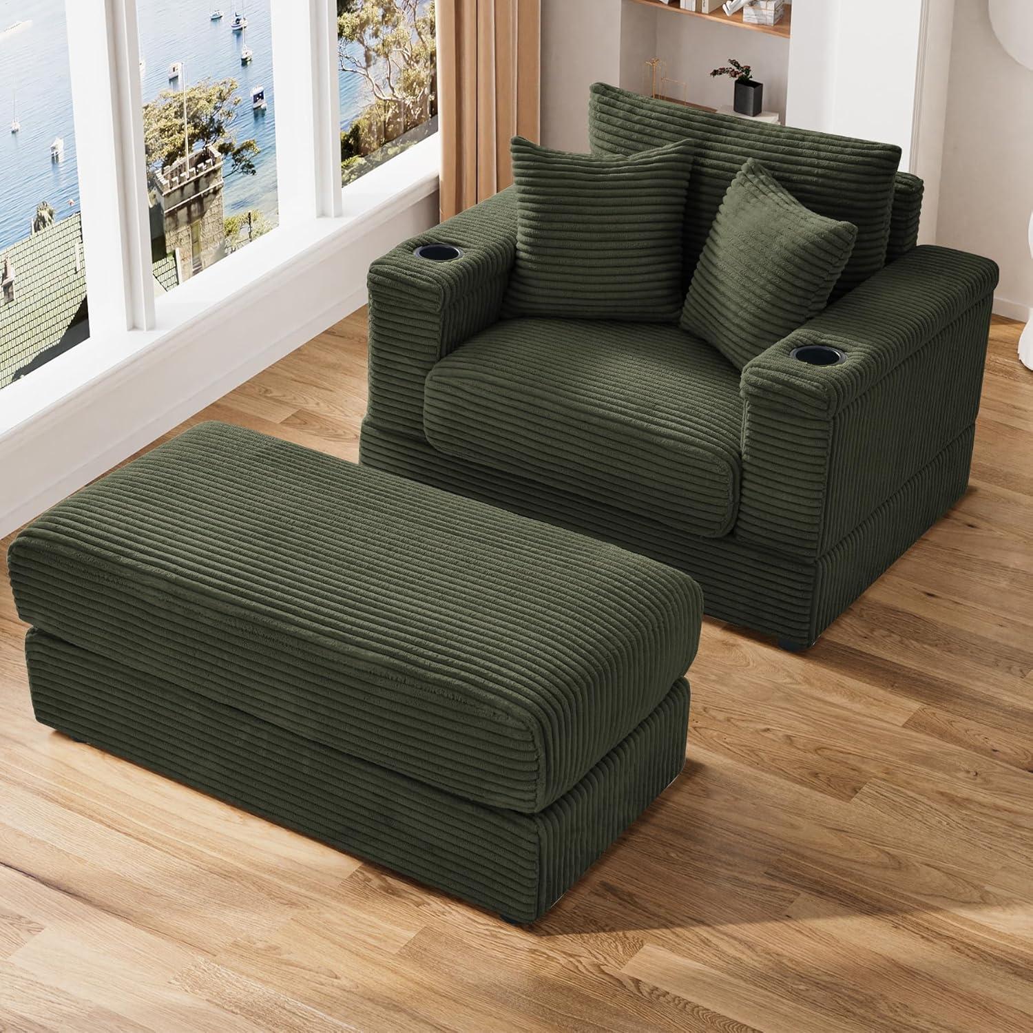 Designed for those who value both style and comfort, this oversized chaise longue chair brings an inviting, cozy vibe to any living room. Upholstered in soft corduroy fabric with a calming green hue, it features deep seating complemented by plush cushioning supported by a reinforced spring system.The inclusion of both back and throw pillows enhances lumbar and waist support, making it an ideal spot to unwind, read, or recline after a long day.Its sturdy build accommodates up to 350 lbs,ensuring durability without compromising on comfort.