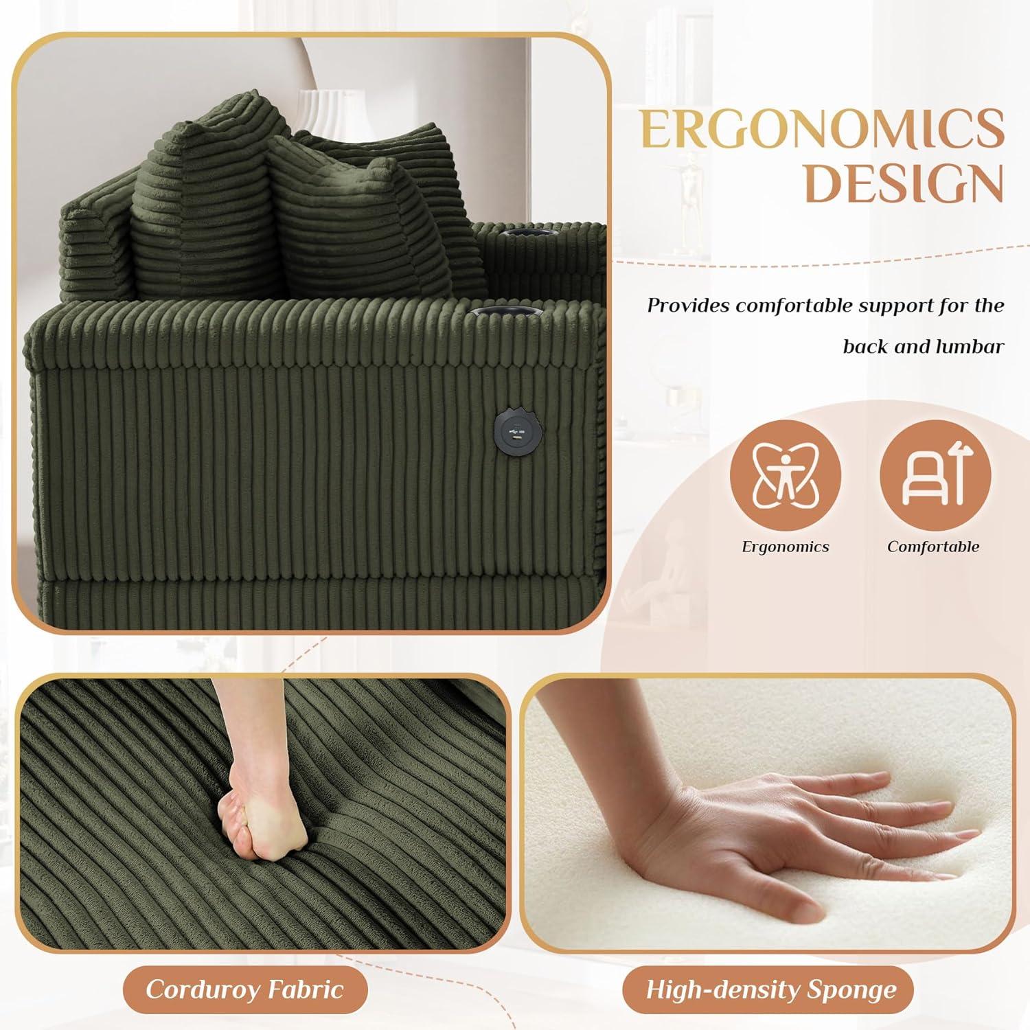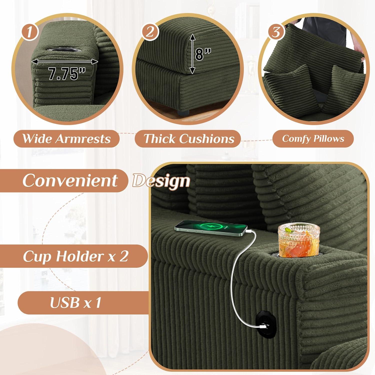 We believe this oversized chaise longue is ideal for anyone who values both comfort and convenience in their living space. its deep corduroy seat, backed by high resilience sponge cushioning and spring support, offers remarkable relaxation for those who love to unwind with a book or enjoy long movie nights. The inclusion of a removable ottoman and pillows adds customizable comfort, making it perfect for individuals seeking ergonomic support for their back and waist. Plus, the USB charging ports and built-in cup holders elevate the experience for tech-savvy users or parents who appreciate keeping drinks within easy reach while supervising kids.