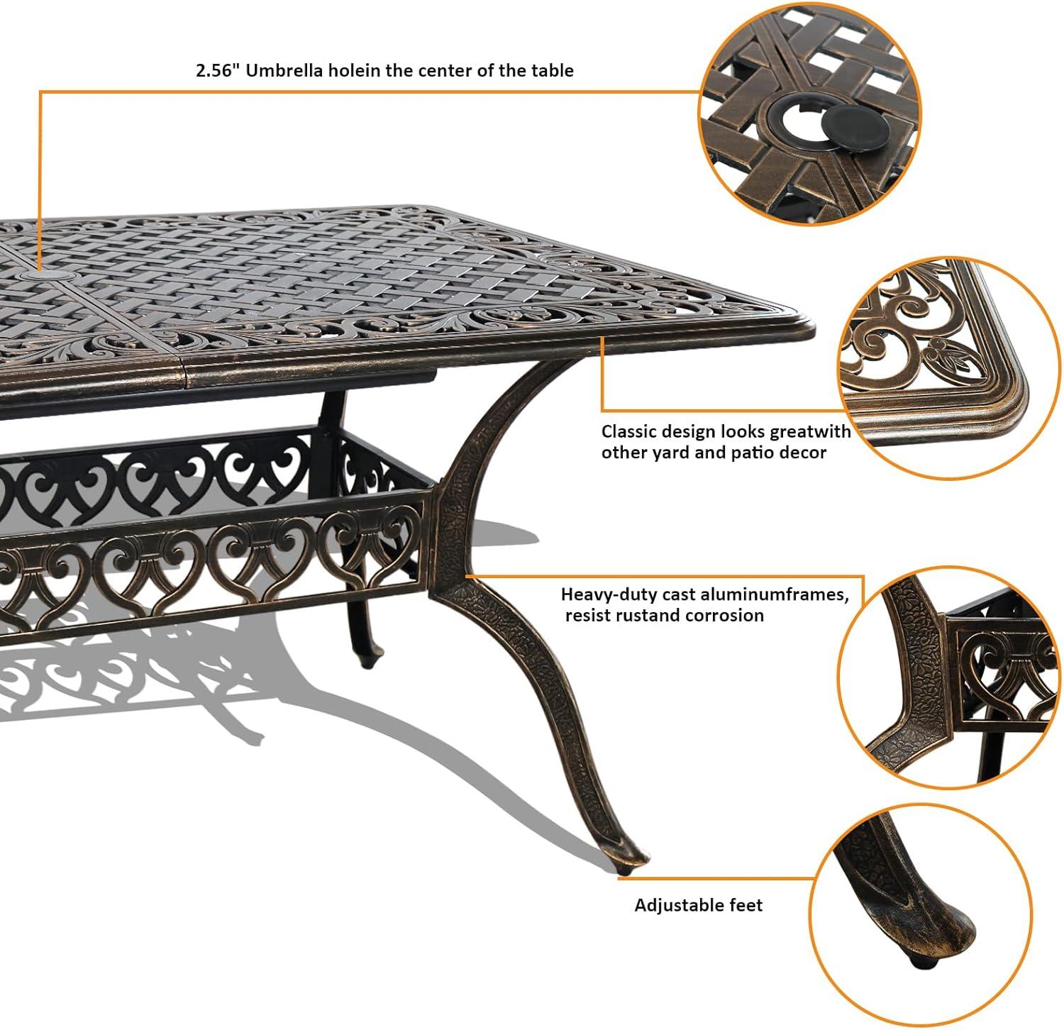 Our experience with this outdoor dining set highlights the extraordinary durability and thoughtful design of the rectangular table. Crafted from cast aluminum, the table not only boasts a strong and weather-resistant frame but also remains lightweight enough for effortless relocation. The brown finish, enhanced by a rust-resistant powder coating, ensures it maintains its charm through all seasons. One standout feature is the centrally located 2.36-inch umbrella hole, which accommodates most patio umbrellas to provide essential shade, making it ideal for sunny afternoons and cooling outdoor comfort.