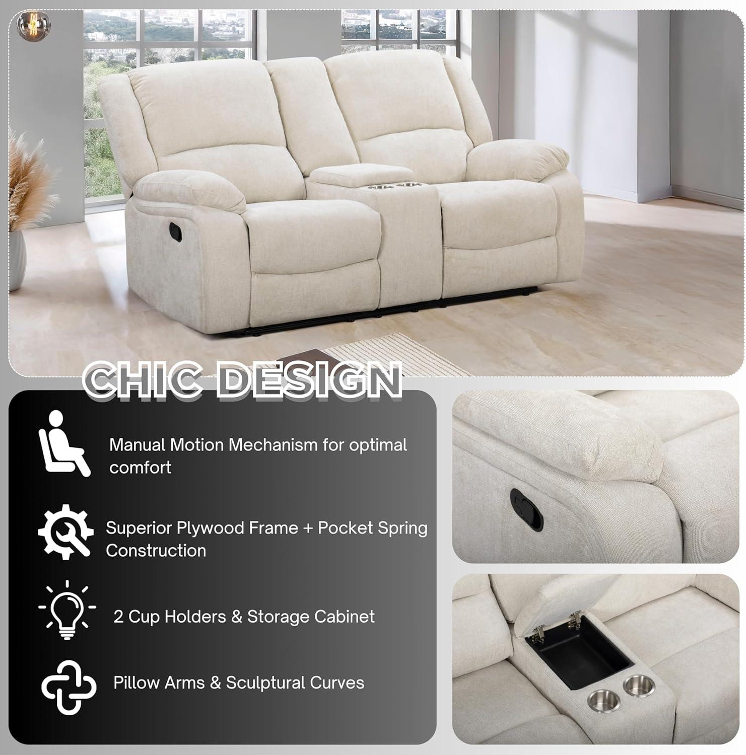 functionality shines through the loveseat’s built-in dual cup holders and cleverly integrated storage cabinet, perfect for keeping essentials close at hand. Construction-wise, the reinforced hardwood frame and durable metal mechanisms provide a reassuring sense of durability and stability. Pocket springs embedded within the cushions further contribute to lasting support, ensuring that comfort endures over time. With full assembly ready on delivery, it’s a practical choice that doesn’t compromise on luxury.