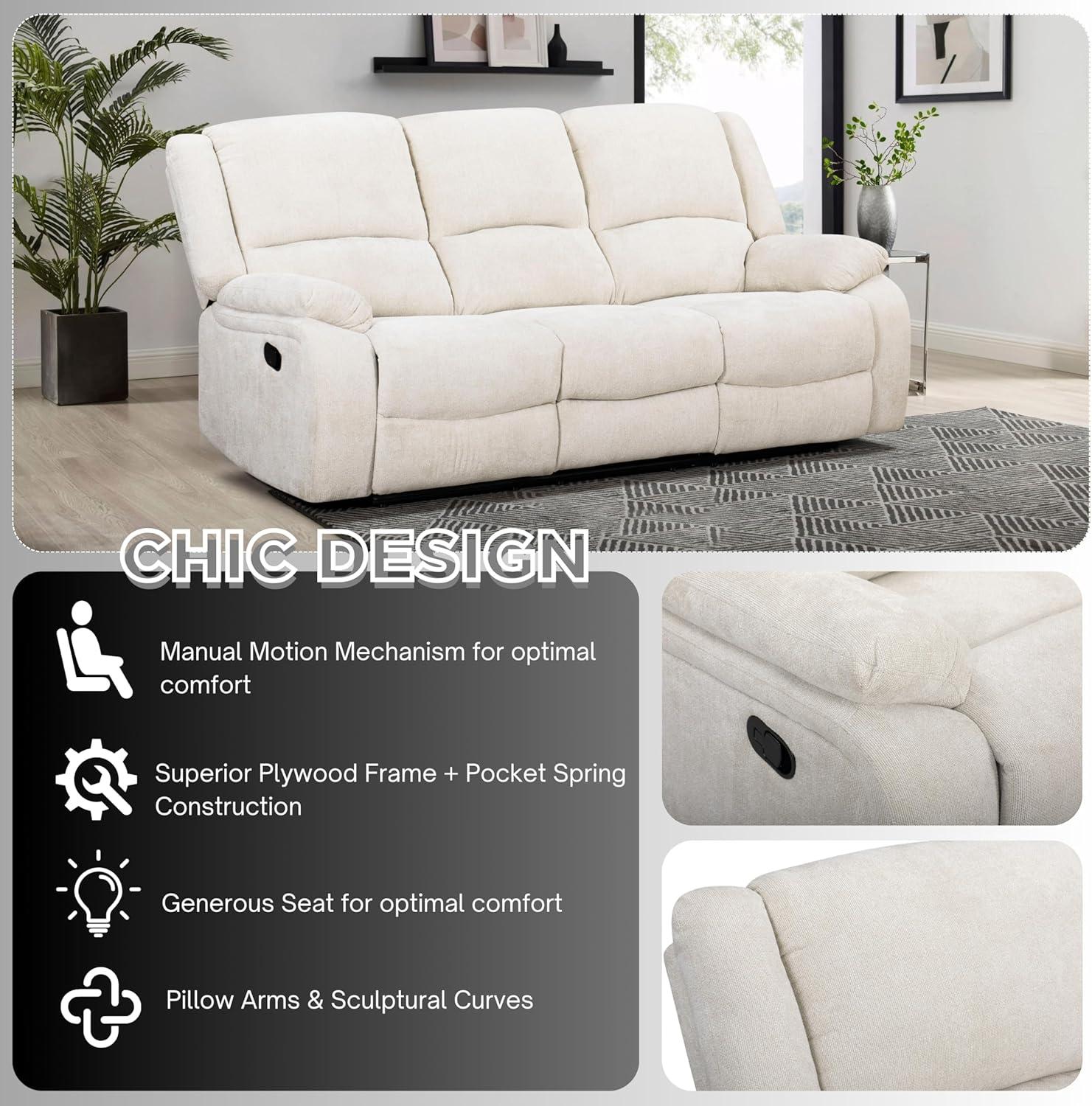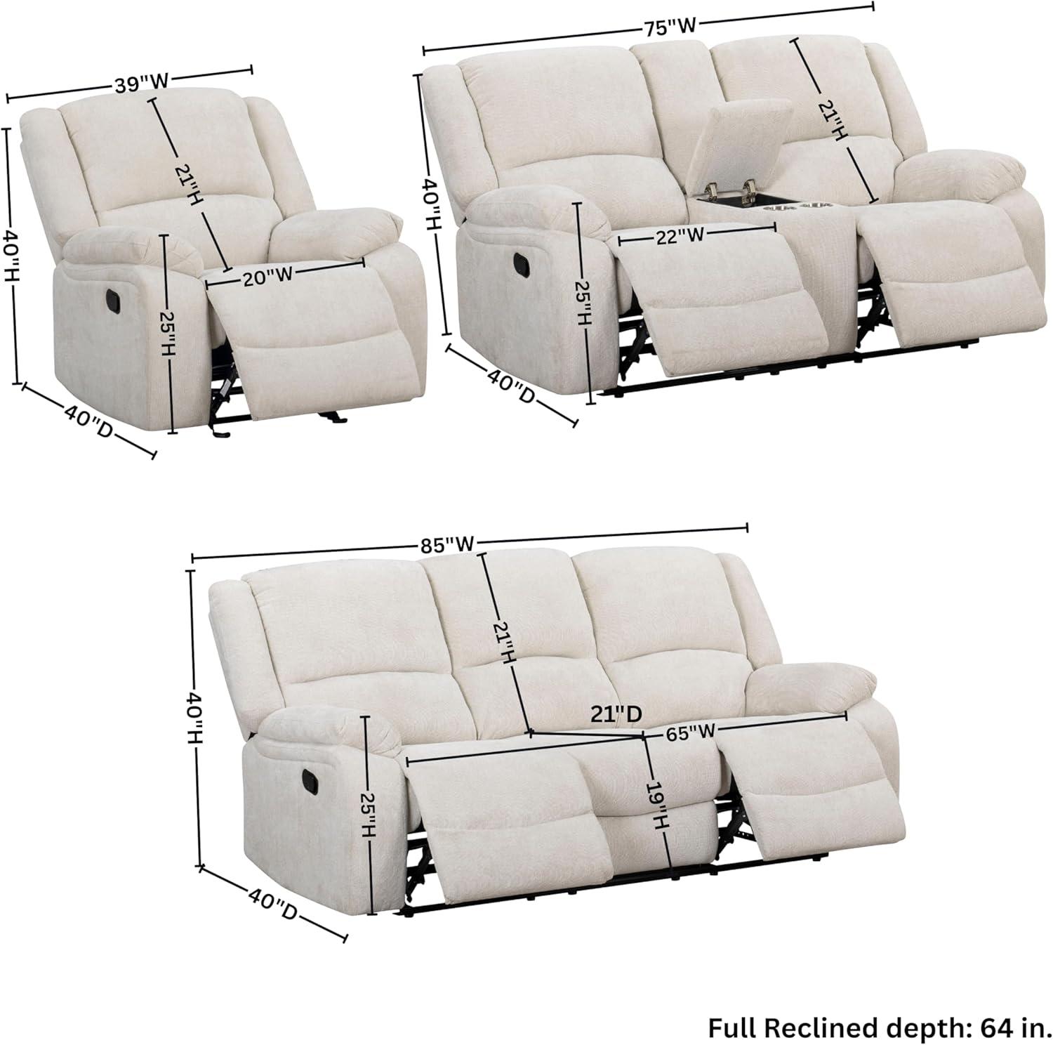 The sand color in this reclining set brings a warm, inviting quality that effortlessly enhances a variety of interior styles.Whether your living space gravitates toward minimalist, coastal, or contemporary vibes, the soft neutral tone acts as a versatile foundation. It blends seamlessly with warm woods and natural textures, brightening rooms with cooler palettes or balancing vibrant accents.The understated hue also creates a cozy ambiance without overwhelming the space, making it ideal for shared relaxation areas where comfort and style meet in harmony.