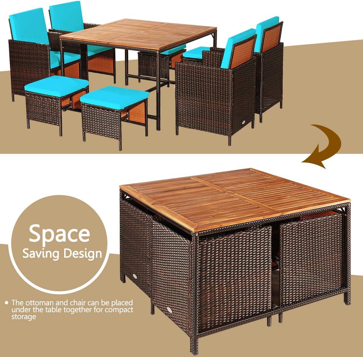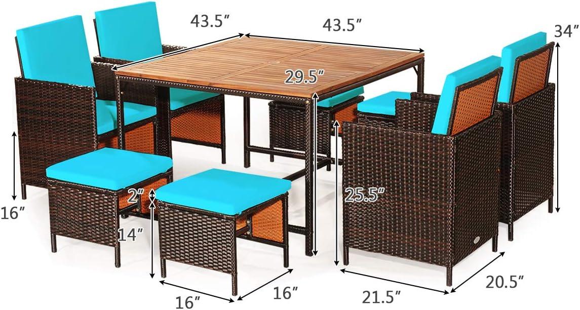 Right out of the box,this 9-piece outdoor dining ensemble makes a striking impression with its vibrant turquoise cushions and elegantly hand-woven PE rattan finish. Designed for both style and practicality, the set includes four chairs, four ottomans, and a spacious 43.5-inch acacia wood table. The chairs feature ergonomic curved armrests and foldable backrests,which immediately signal a focus on comfort and relaxation. Each seat is paired with thick, high-density sponge cushions covered in removable, easy-to-clean zippered covers-making upkeep effortless. The ottomans serve dual purposes, acting as cozy footrests or extra seating when entertaining larger groups, offering great versatility for a backyard or poolside setting.