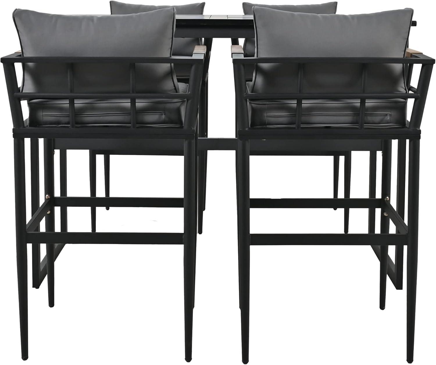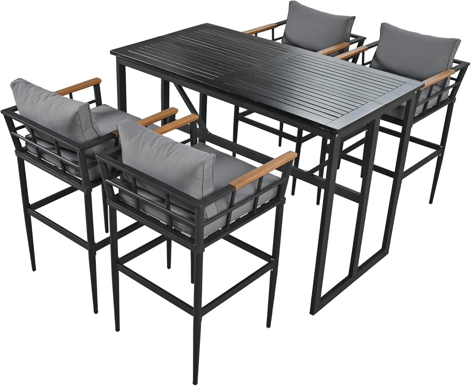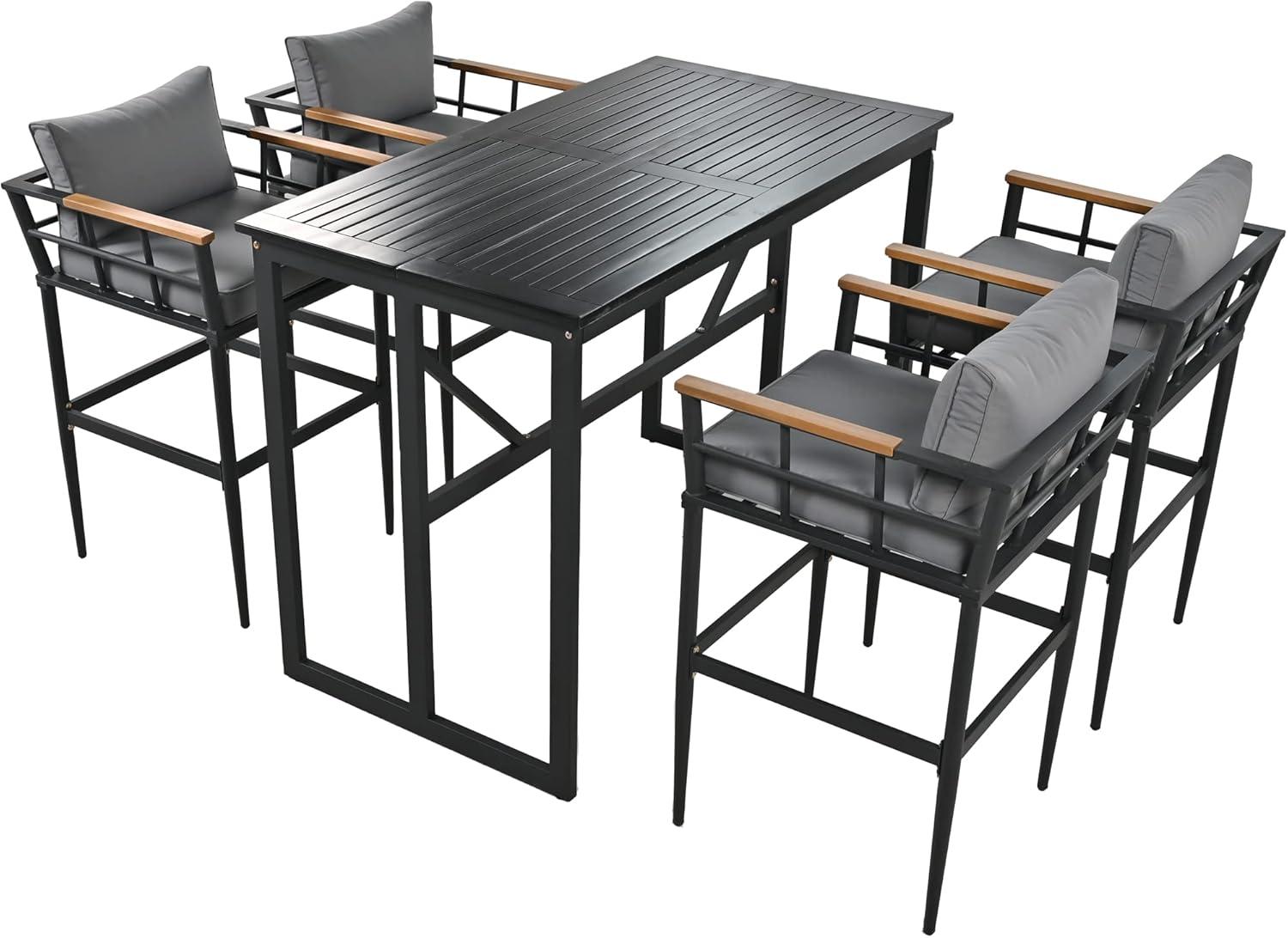 Set up on a compact balcony, the table and four chairs present a tight, rectangular footprint: the chairs slide in under the tabletop so the visible footprint is largely the table itself, and the surrounding walkway feels narrow once the chairs are stowed. On a backyard patio the grouping reads as a clear dining zone — when chairs are pulled out for seating the usable area expands noticeably, and the acacia armrests become the widest projecting element as people settle in and shuffle to make room.
